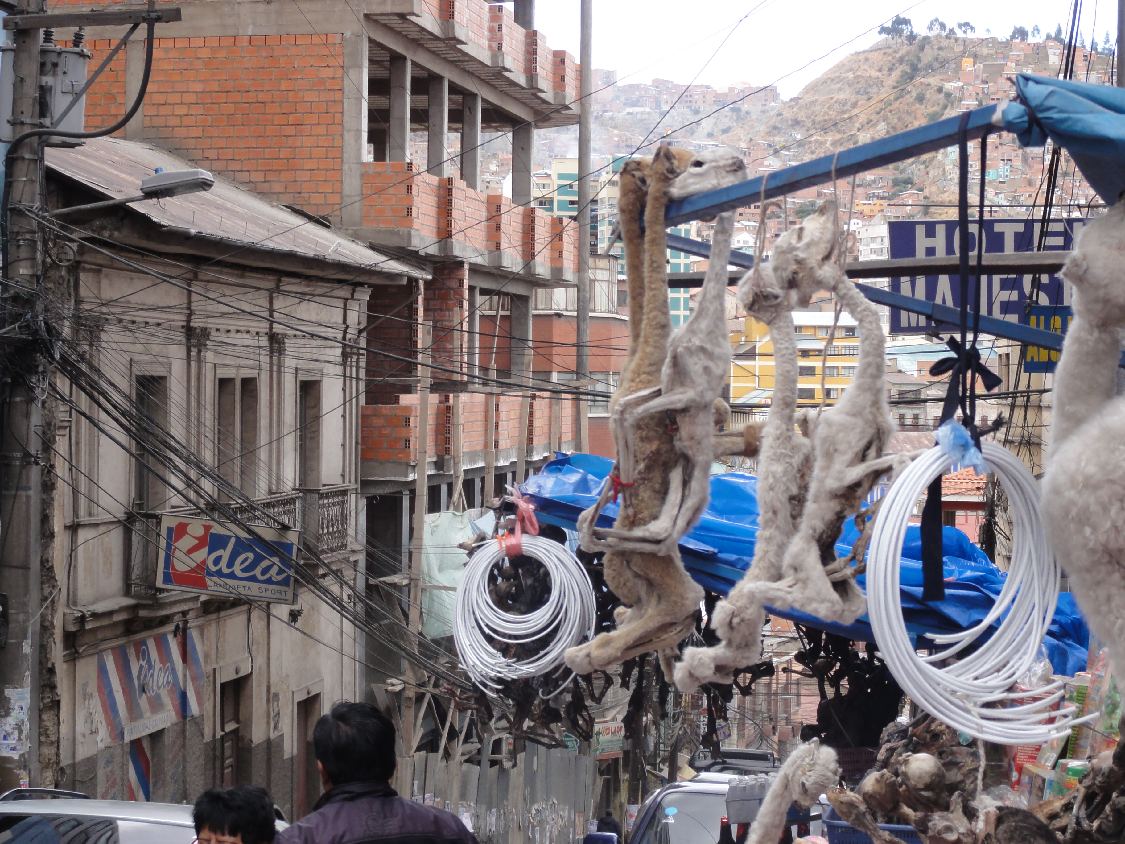 …llama fetuses. Up Sargarnaga on a cross street, curious travelers will find the witches’ market, where vendors sell dried llama fetuses among other interesting trinkets that bring luck or blessings to your home. If you’re lucky, you might even see someone blessing a fetus or a display before selling it to a fortune-seeking Bolivian.