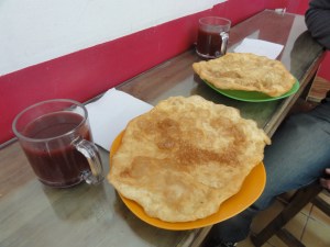 Api is the purplish drink that’s nice and hot, and looks like a Christmas candle. It’s got little specs of various purple and red colors that look like glitter, and it tastes cinnamon-y and very much like perfection. I had it last time, but there’s no passing up api. It’s actually made from maize, but I’m not sure how. Bunuelos are the sweet fried dough, and were thin and very tasty.