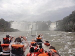 After exploring on foot for a while, Julio encouraged all of us to take a boat under the falls for a decent price. I suspected it might be a tourist trap, but our whole group went, and probably Julio just wanted some time off to sip mate or something. It wasn’t all that impressive, though it was fun. We hopped in some open jungle bus thing and rode down to the river via a jungle trail. At first, it was an exciting mixture of off-roading and toucan-spotting, but then we stopped for about ten minutes at a palm tree while our guide told us about heart of palm in both English and Spanish. It’s pretty interesting when it comes to the means of obtaining heart of palm, but you know the trip isn’t going to be that spectacular when the highlight is a notably tall palm tree.