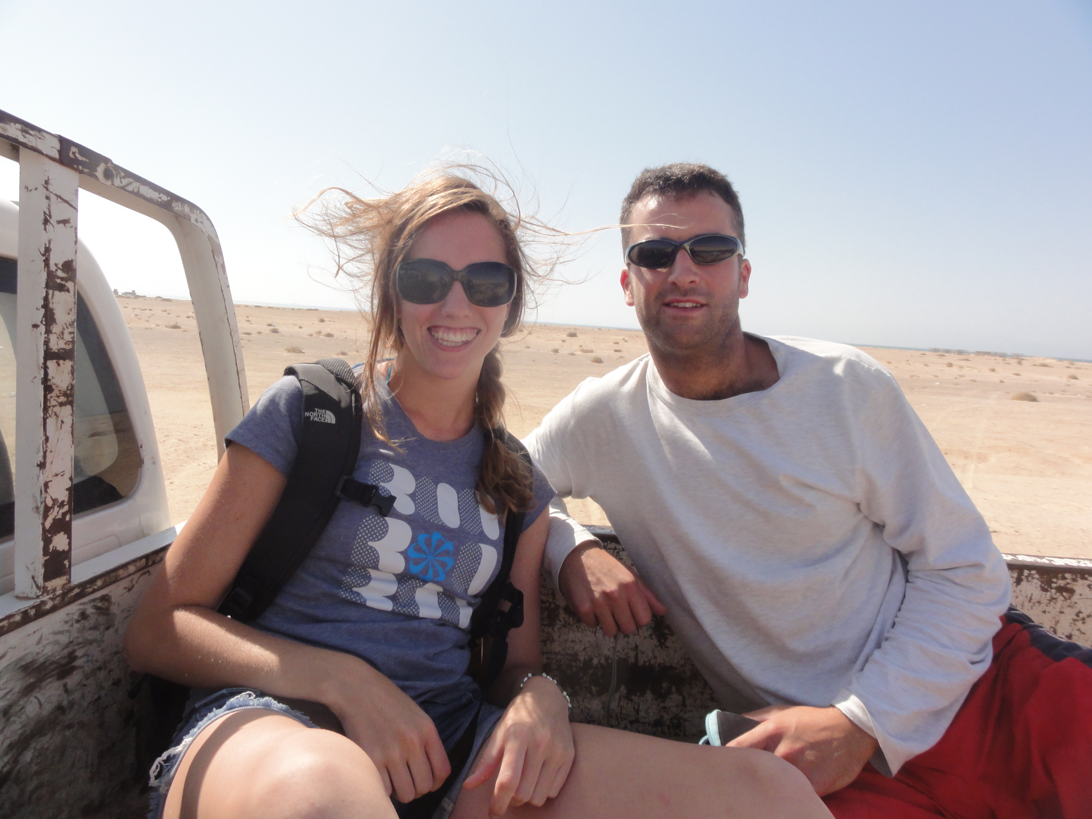 Then, our poor driver called us a truck (a lorry, as Simon calls them) to pick us up at the desk. The truck was small and the cab could’ve fit us, but we decided to ride the way they do on the Autostrad and in Central America (according to Blanca). We sat in the back of the truck and flew down the road, flying over speedbumps and spitting dust out of our mouths.