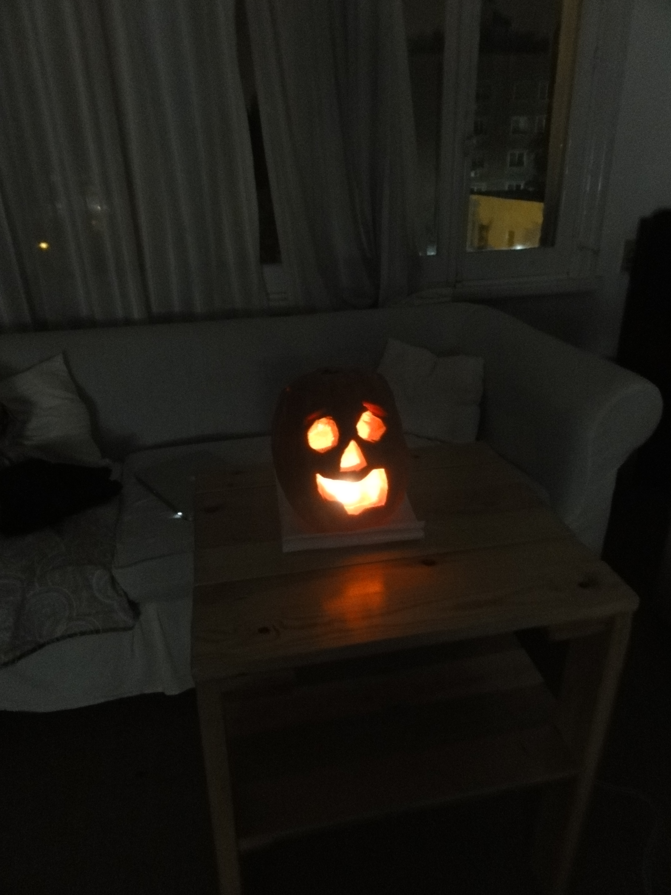 Then it was time to celebrate Halloween. I took my least-rotted pumpkin and headed over to my friend’s house where we watched the remake of Fright Night – not nearly as good or eerie as the original but Colin Farell wasn’t bad to look at -, lit the pumpkin, and lamented the old days when Halloween was scarier and we were littler. I miss apple picking and pumpkin picking and hayrides and haunted houses equipped with strobe lights and masked marauders, but this was the best we could do, and it sufficed for me. I nervously caught a cab home, as apparently it is hard here to discern between Mischief Night and Halloween; roving groups of juveniles patrolled the streets with egg cartons, but I made it home unscathed. Someone needs to explain how Halloween is really done.