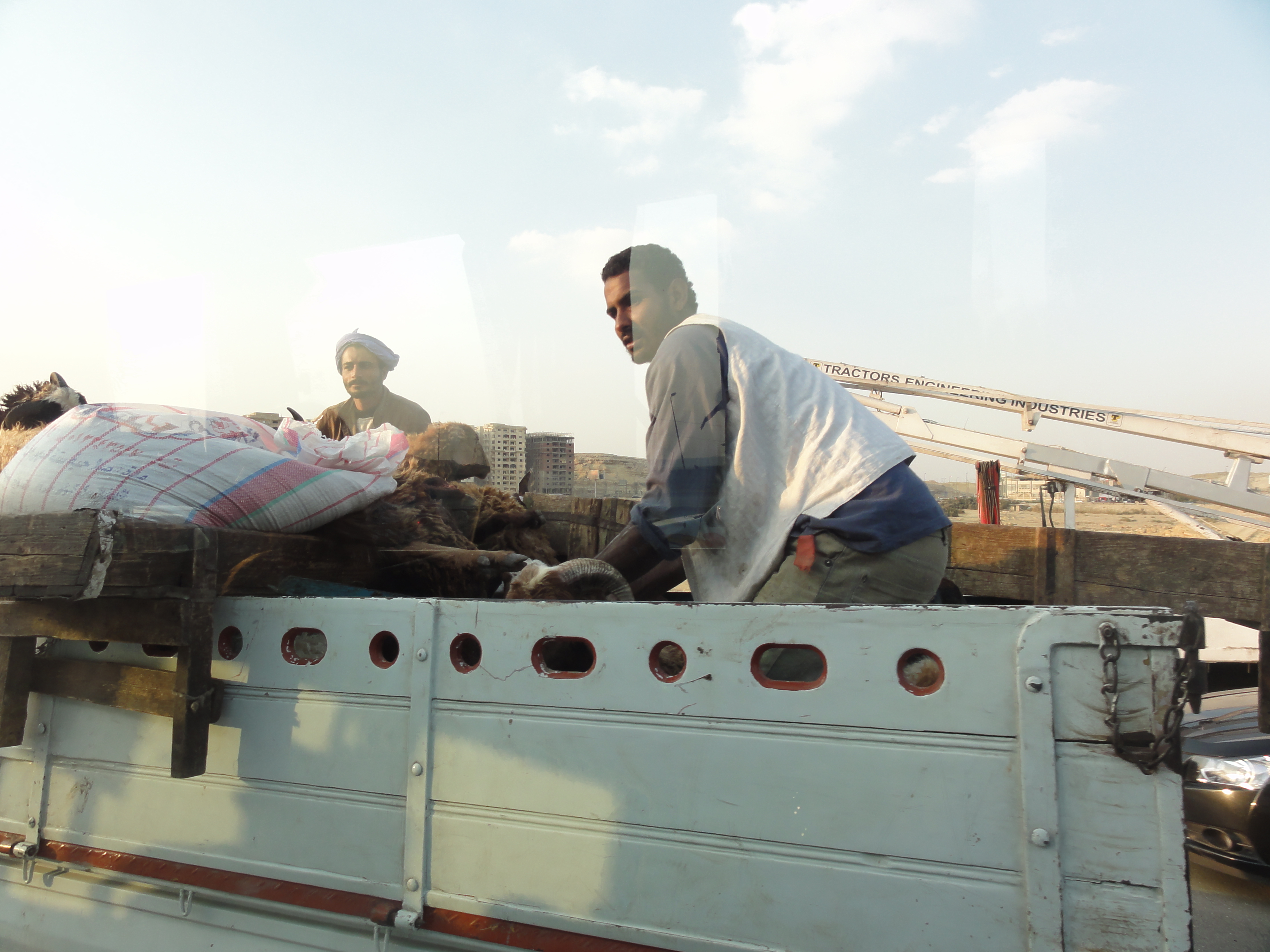 Today was largely uneventful until the ride home, when our bus eased alongside a truck filled with goats and a man who was slaughtering them. We’ve seen some pretty bizarre things here in Cairo, especially on the ride home, but this took the cake. We all groaned and yelled as we watched goat after goat succumb to the Egyptian man and his knife, and we quietly turned our heads while snapping pictures like the voyeurs we are. Once we’d left the goat slaughter-truck behind, we were rear-ended by some guy. The goat truck passed by alongside us again, honking, goat carcasses flopping against the windshield.