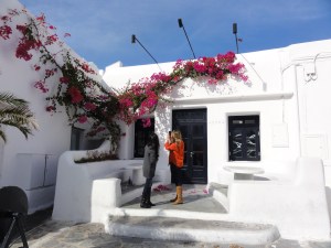 A part of the Cyclades chain of Greek isles, Mykonos is a four and a half hour ferry ride from Athens and boasts a coastline that can be traveled in its entirety in well under an hour. Its pebble beaches ring the mainland, which is basically a labyrinth of thick-walled white homes that spring from the cobbled streets like molars. Soft and square, the buildings could have been carved from soap or stone, and are blindingly white in the sun and blue in the moon. The doors and railings, by law, must be painted a basic, earthy color – but, to be fair, we did spot a pink door – and the simple white walls make the doors and the bougainvilla pop.