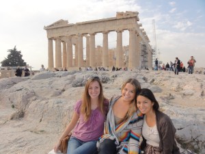 On the ferry ride home, we used Ashley’s iPhone to find a cheap hostel in Athens and ended up choosing Athens Backpackers, a top-reviewed hostel with a two-minute walking distance from the Acropolis. We spent the night out at a bar nearby – cab fares double between midnight and 6am – and spent the next day cheaply exploring Athens. We walked to the Acropolis, presented our college IDs, and received a 50% discount, chopping the entrance fee from 12 euro to 6. The ruins are beautiful, and it’s always mindblowing to touch a pedestal or column that’s been around for centuries. What’s sort of disappointing is the amount of construction. The Parthenon was ensconced in scaffolding, and many of the archways and pillars were also surrounded by beams and, in some cases, actual construction equipment. (Unless Komatsu is going to be considered one of the Greek gods of Mount Olympus.)