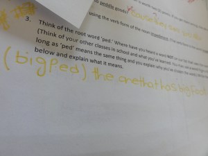 As an extra credit question on my students’ ‘ped’ quiz, I asked them to name a word using the root word ‘ped’ that was not on our list. Some wrote ‘pied,’ which was good, or ‘pseudopods,’ which was also good. Some made up words and openly admitted that they had made them up. But my favorite was “bigped,” partly because it sounds hilarious, and partly because the student confidently wrote that a “bigped is a big footed creature.” I admire creativity, hey, she knew the meaning of the word.