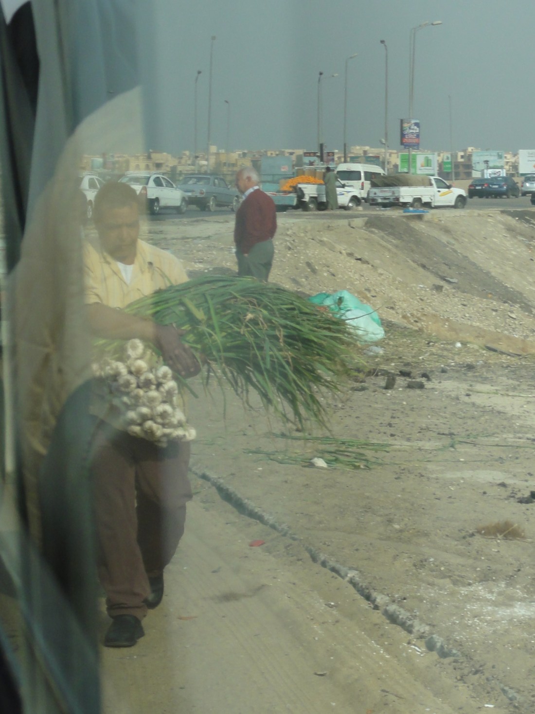 So, instead, I’ll cook. In an effort to be a culinary queen, I’ve decided to acquire some essential herbs and vegetables. This has been no easy task. Last week, our boss spotted a cart of fresh garlic and had the bus pull over to the side of the ring road so he could purchase a kilo. Due to a miscommunication, he received ten kilos, which resulted in a minor acquisition for me and a half an hour bus ride spent gagging. I promptly placed the garlic on the balcony, where it has weathered the recent dust storm in a plastic bag.