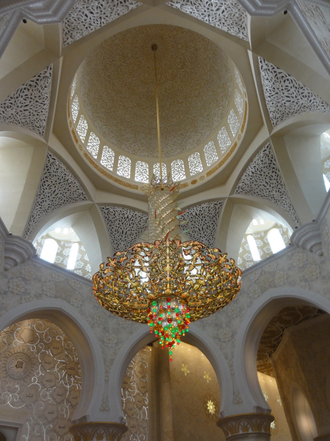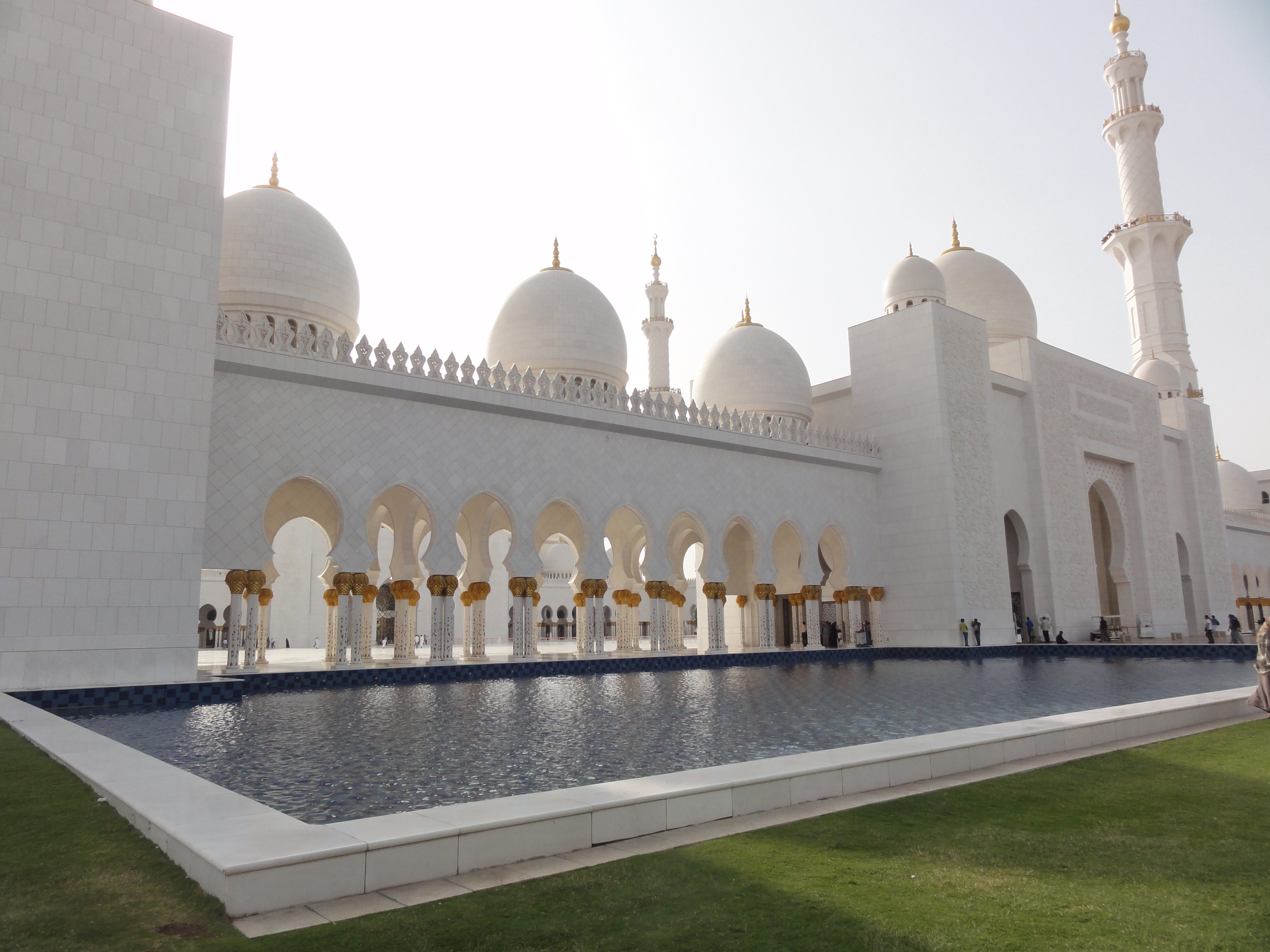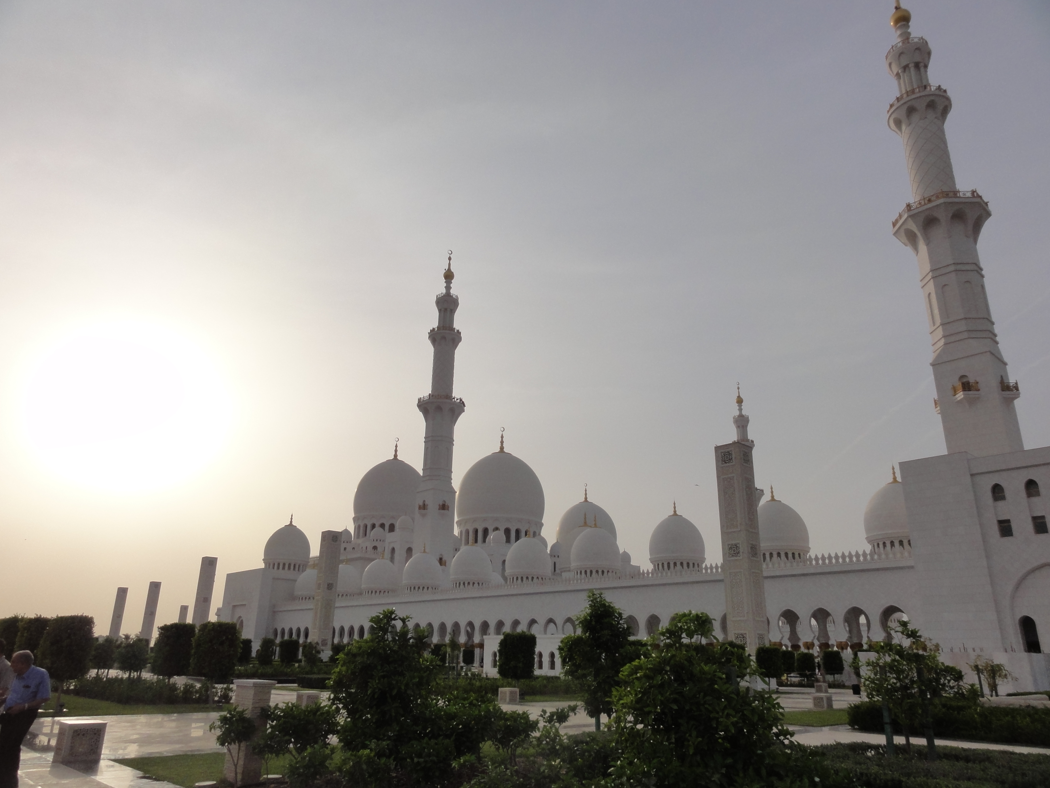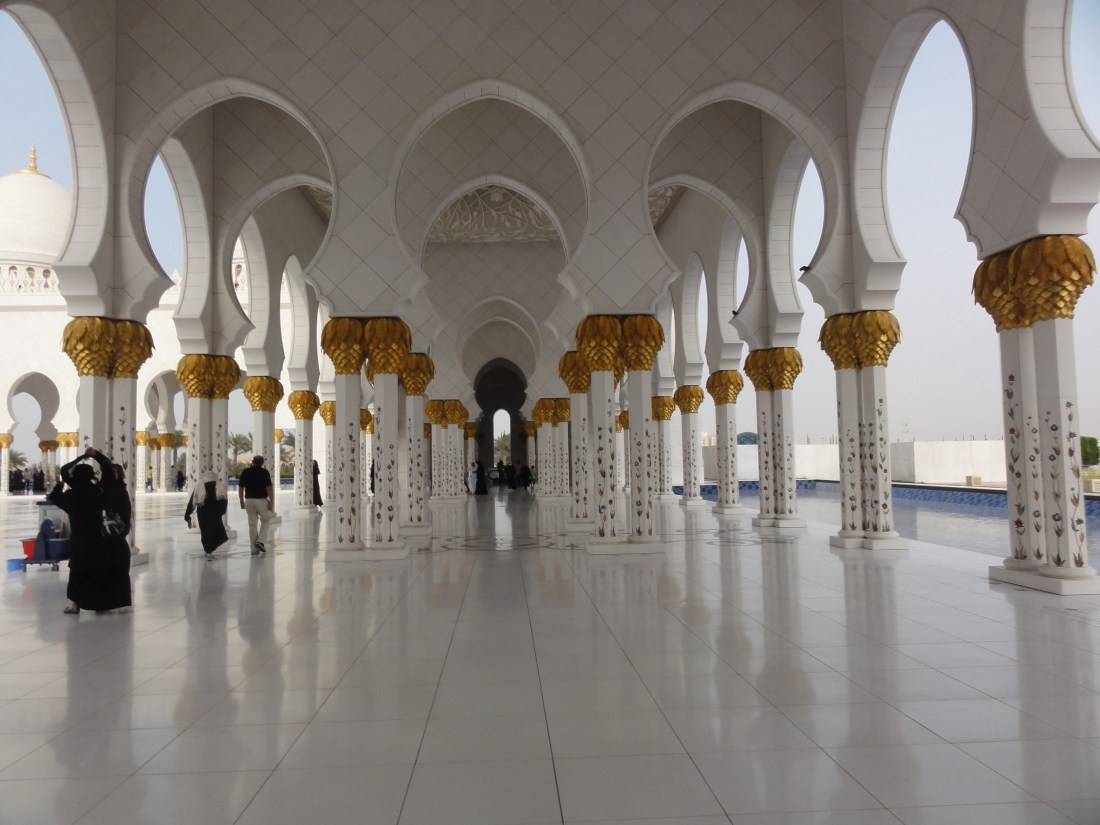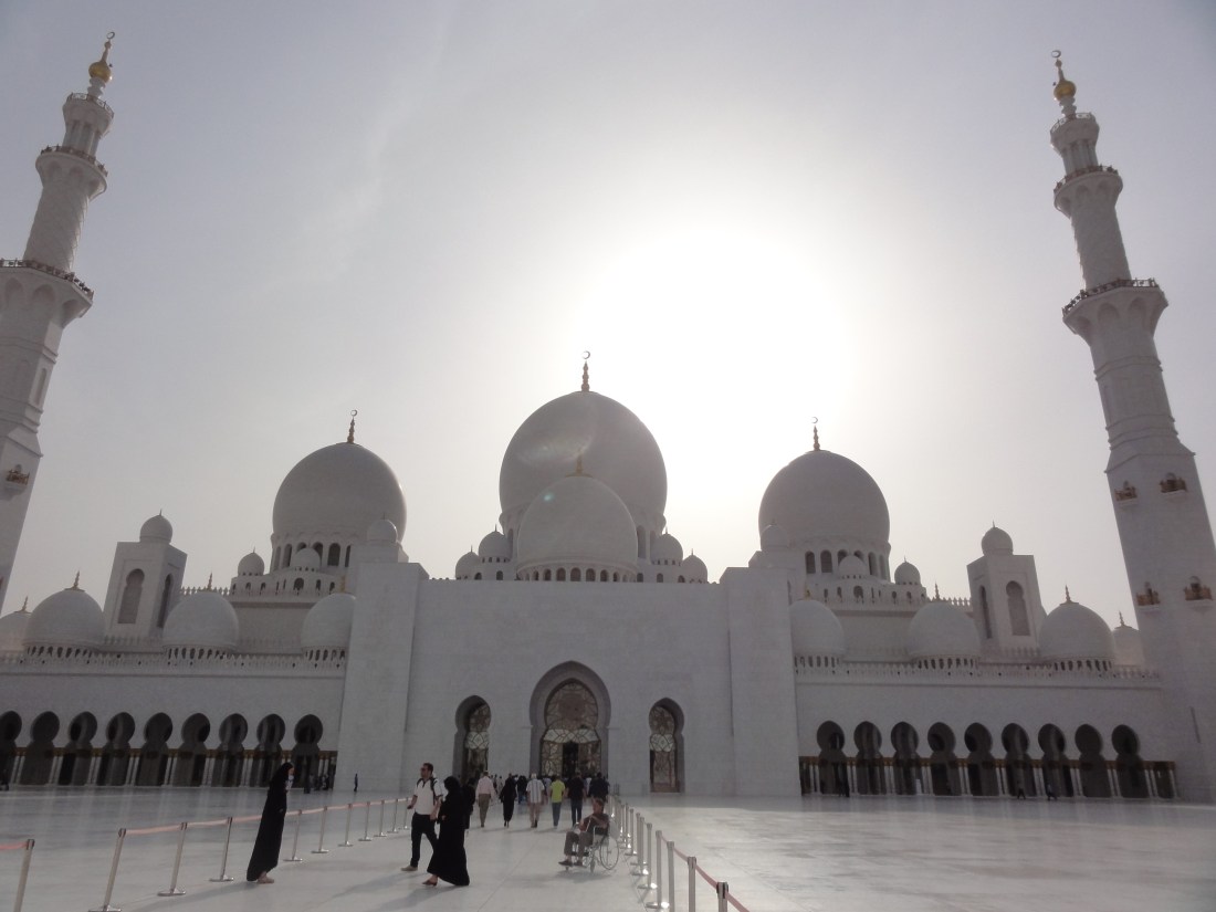 Just before sunset, we hopped in an expensive cab and headed out to the Sheikh Zayed Grand Mosque. Now, I’ve seen mosques before in both India and Turkey in addition to those in Egypt, but none even come close to this one. (Despite visiting and observing mosques, I do not consider myself an expert on mosques. However, I like to think I have a decent eye for aesthetics.)