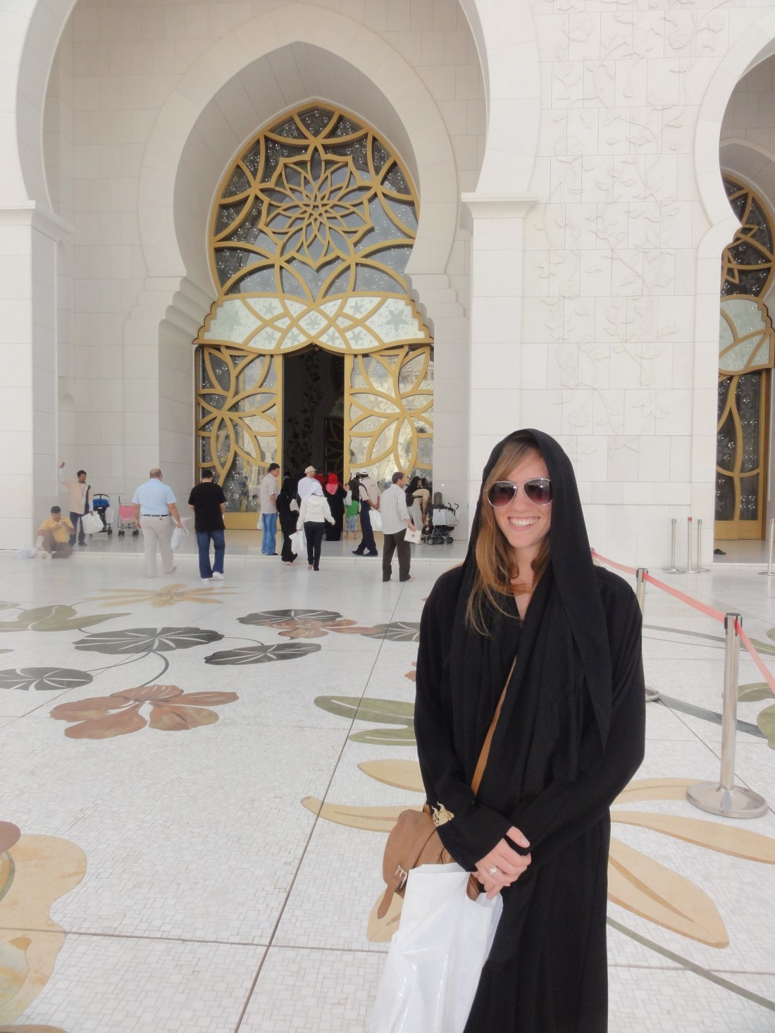 Before entering, we had to cover up. I was expecting this, as I’d had to cover my head in Turkey and my entire body in a brightly colored gown in India, but I was not expecting the degree of concealment required here.