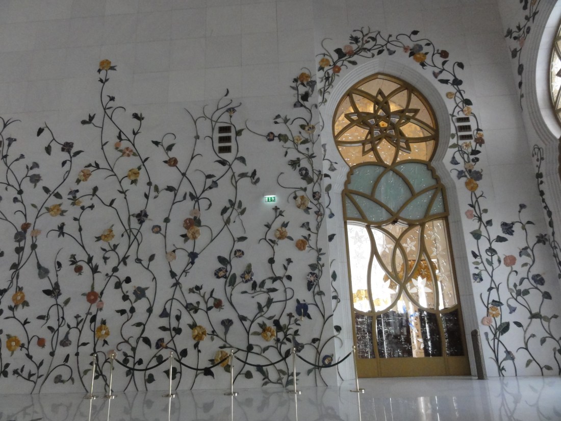 This mosque boasts the largest carpet in the world, and from the cavernous ceilings descend brilliant, vibrant chandeliers glittering with thousands of Swarovski crystals. The carved, looping filigree on the wall was eyecatching at first, but splendid when light from the setting sun filtered through it. The entire mosque was stunning in its beauty, which is surprising in itself; in India, we’d learned that Muslim architecture, specifically mosques, lacks ornate, intricate designs, as its creators favor simplicity. But here, in the middle of Abu Dhabi, Sheikh Zayed Grand Mosque stands in beautiful defiance and salient peace.