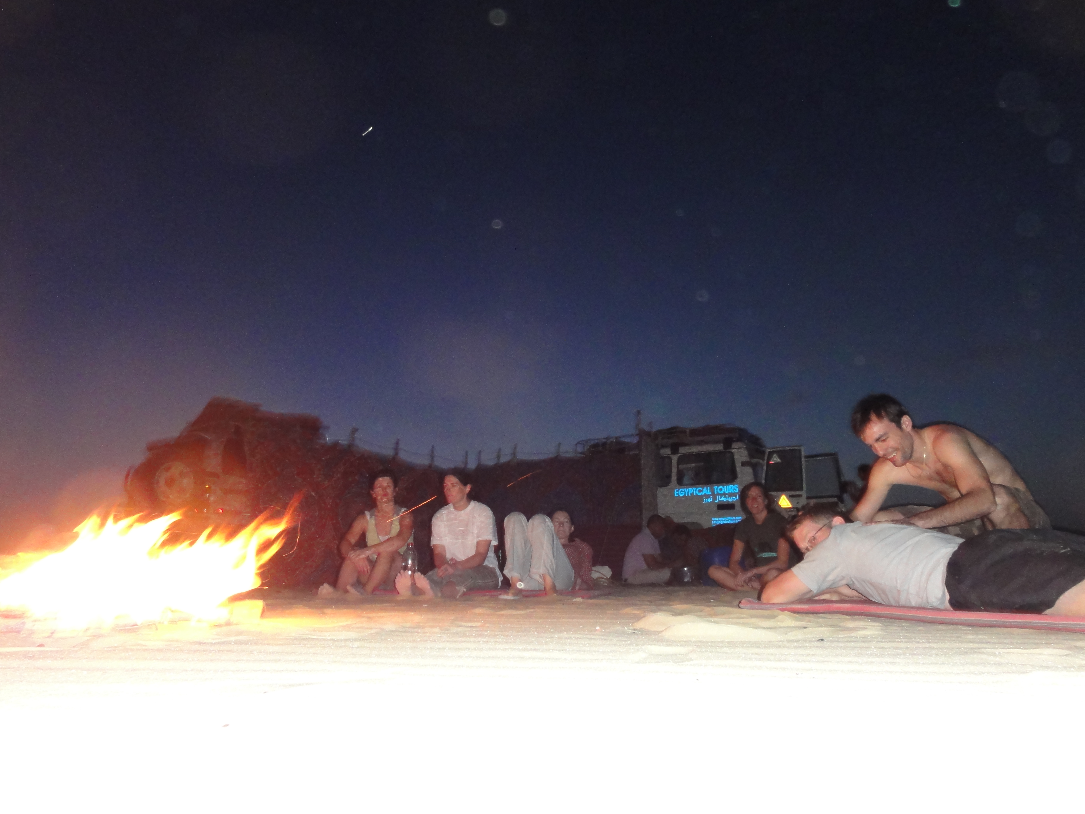 Sarah, Anna, and I watched a bleary sunset while the guides set up our campsite, a slew of blankets tossed over the sand beneath nothing but billions and billions of stars overhead. With twilight came a few desert foxes, the first arousing our curiosity as it trotted happily toward our campsite.