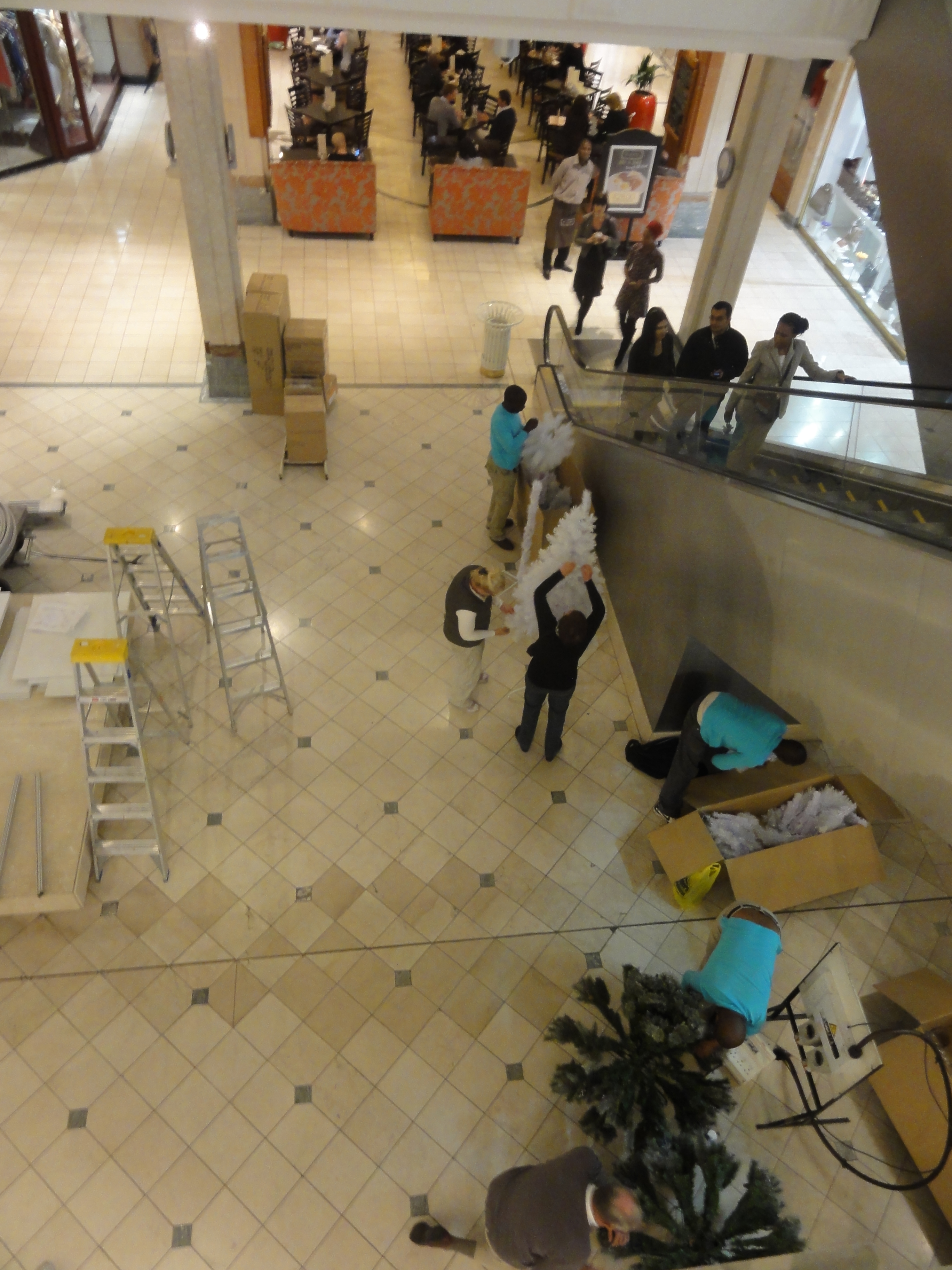 By nightfall, the temperature dropped and Shannon and I scored some toasty winter gear at an outdoors store in the mall. In the atrium, employees fastidiously erected Christmas trees.