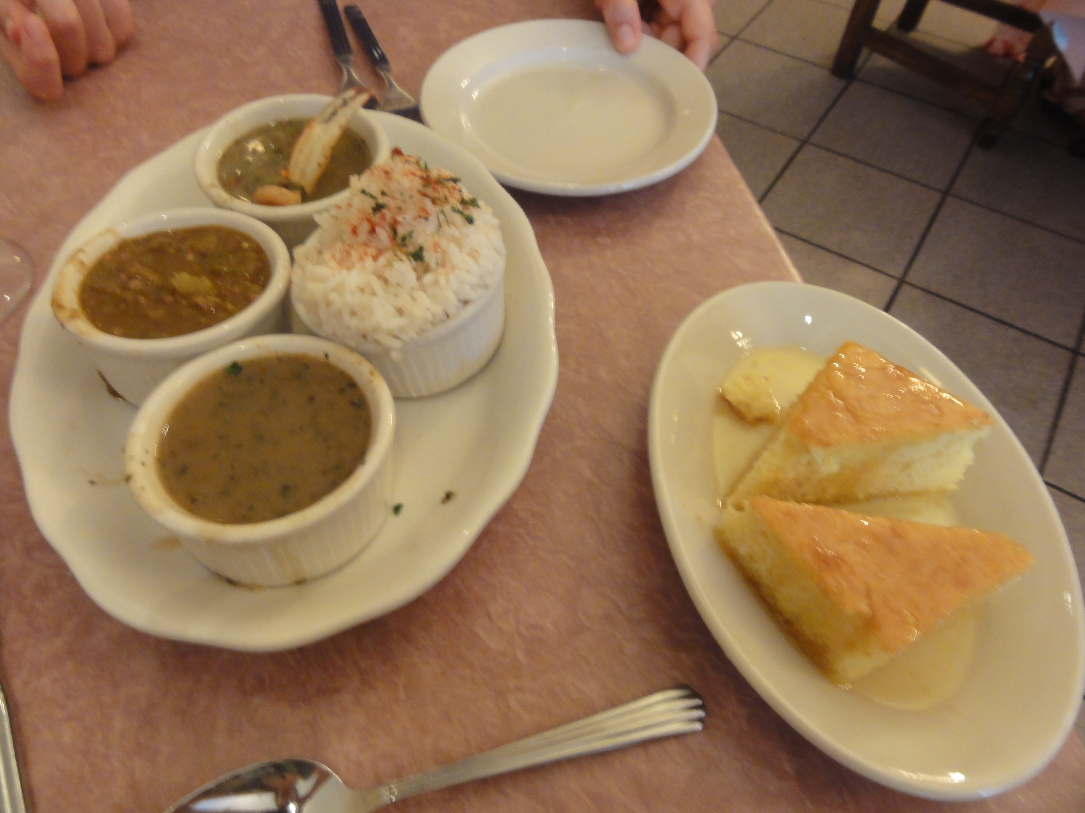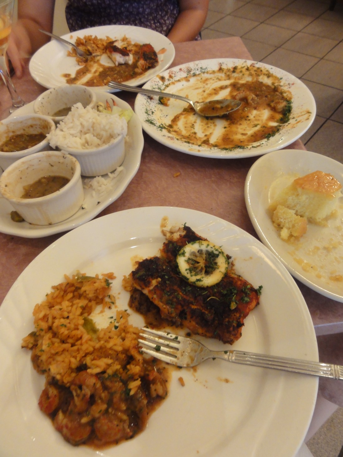 At this point, we were feeling pretty heavy so it was time to eat. In an effort to cross off the majority of our list, we ordered the following: Sazerac (a uniquely New Orleans cocktail featuring whiskey); Sweet Tea Vodka (just because); a gumbo sampler with seafood, Creole, and tomato gumbo; cornbread glazed with honey and butter; salads; catfish fillet; jambalya; and crawfish etouffe. And bread pudding for dessert.