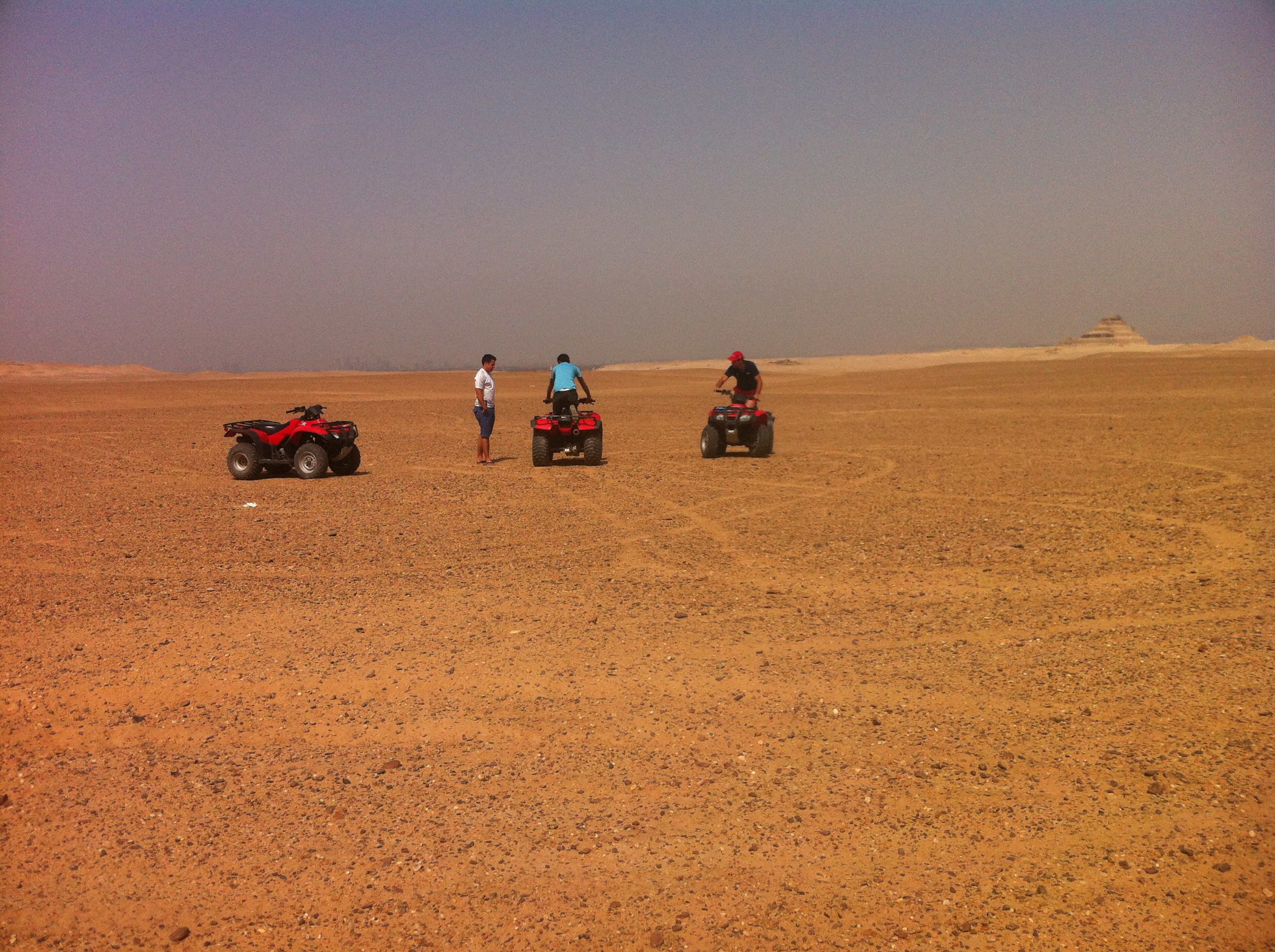 Well, James and Antony were off. I cautiously putted behind them at 25km, concerned I might accidentally rev the engine and collide with one of them. Our guide took us to Sakkara and then out into the desert where the pyramids of Giza silhouetted against the hazy Cairo smog. It’s amazing how long it takes to travel between the Giza pyramids and Sakkara by car (45 minutes minimum) and how quickly the distance is covered when flying across unobstructed desert.