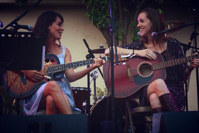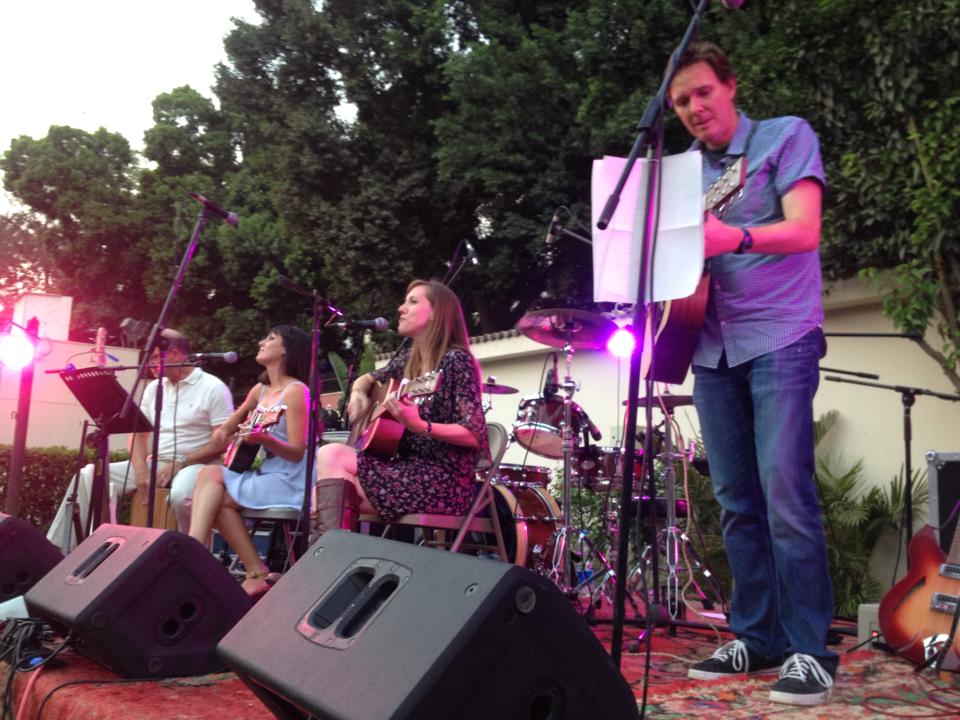 Laura and I were both nervous. There weren’t a lot of people settled at the tables yet, but the atmosphere was buzzing. We went upstairs and took a shot of Chivas, then retreated back down to a grassy patch between a bush and the stage and started strumming some songs. Two of the band members joined us, one soloing on lead guitar and the other bringing out a cajon, a really cool four-sided drum box. It was about that time I shook my nerves.