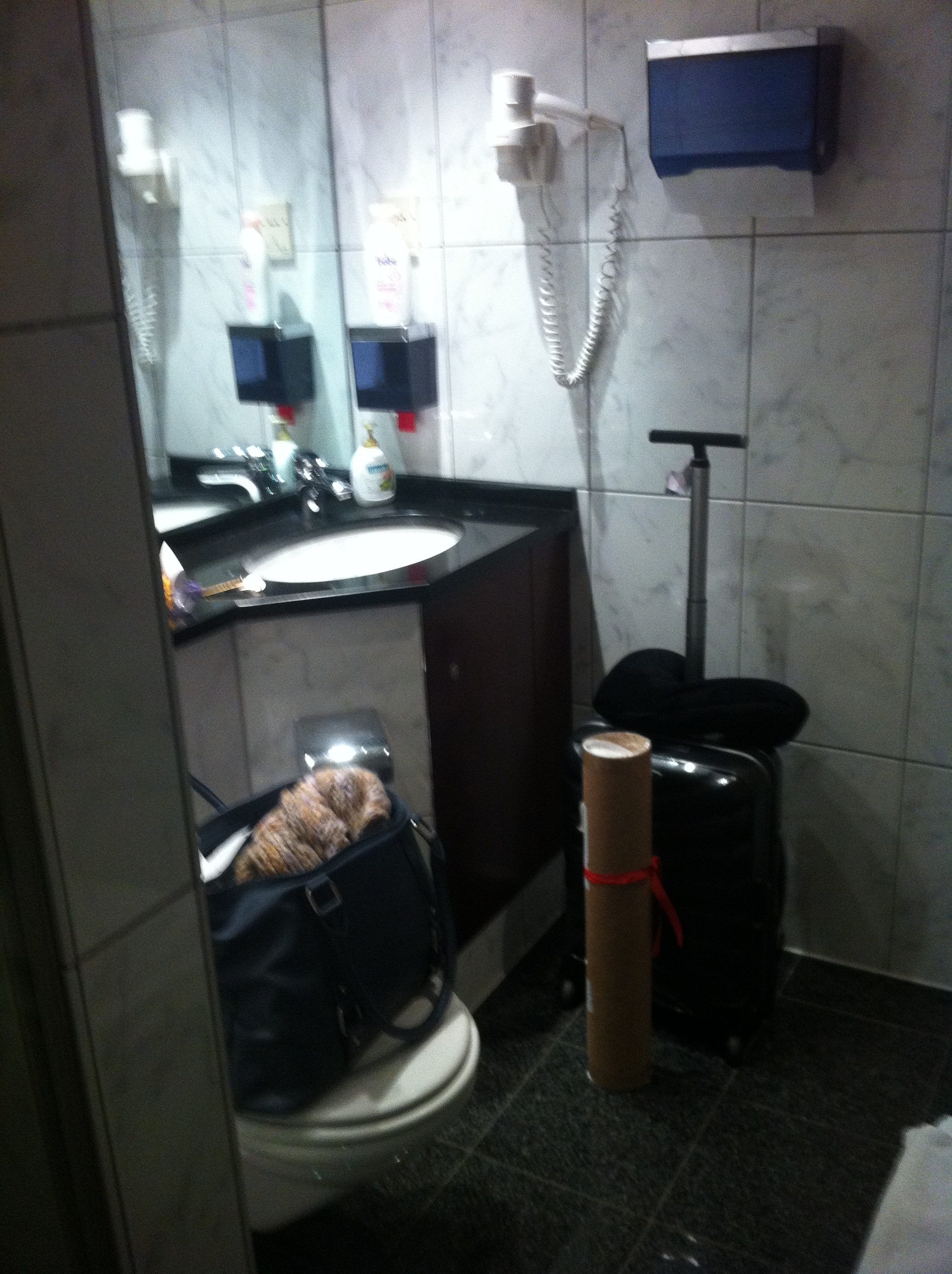 Unwilling to pay $150 for a room that did not include WiFi, I trekked back to the airport, determined to find a shower. Matthias, my handy German friend, had Googled lounge information for me prior to my trip and had sent me a link to a payable access lounge that he claimed had showers. Without WiFi, I couldn’t locate it, so I instead followed the signs labeled “Douchen” with sketches of sprinkling shower heads on them.