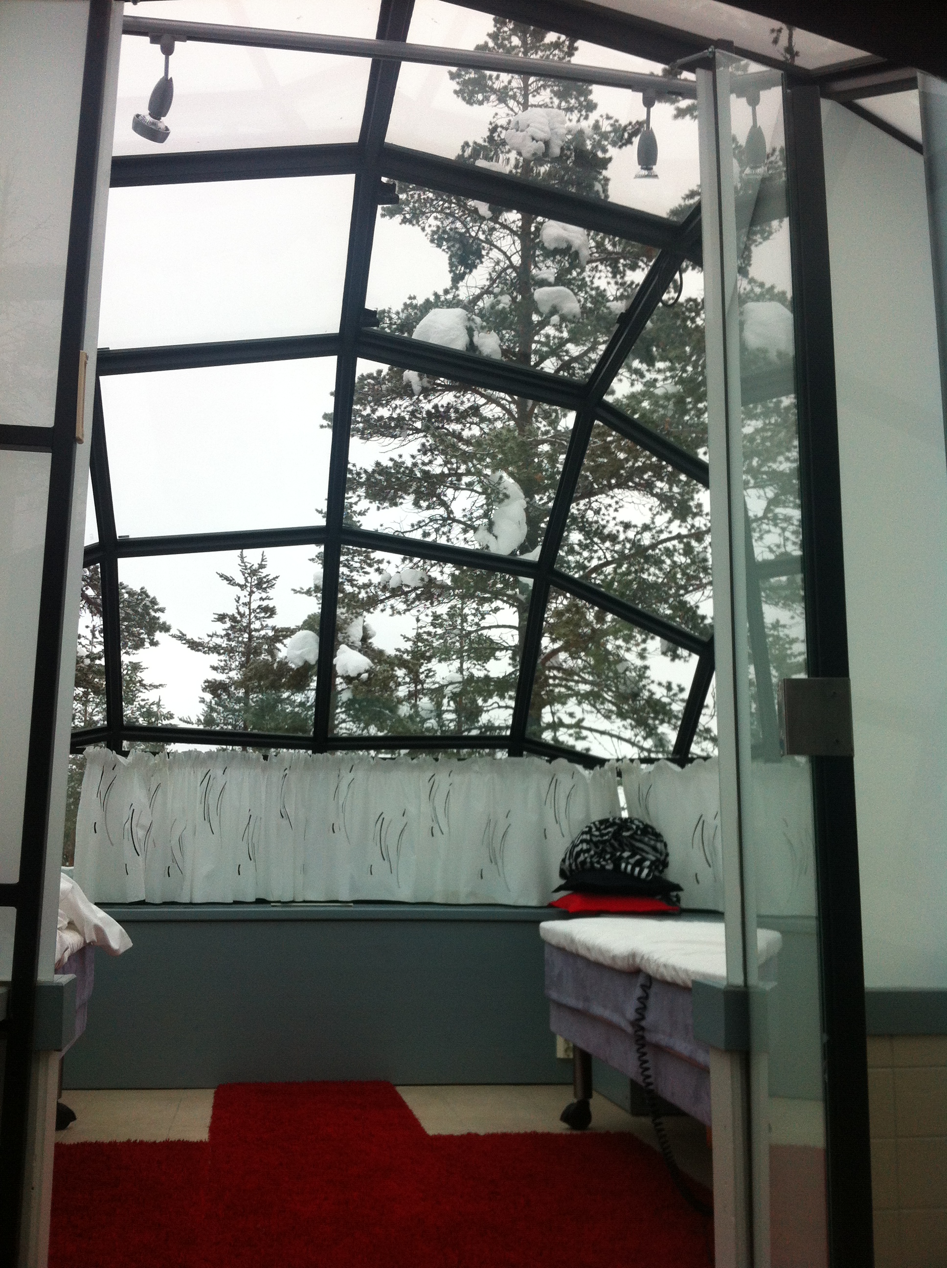 For this reason, along with a slew of TripAdvisor reviews rating the igloos mediocre, we opted for the log cabin: at 469 euro a night, the warm and roomy Kelo pine cabin provided a kitchen, two bathrooms (shower included), a fireplace, bunk beds, a Queen-sized bed, a spacious porch, and a sauna. I thought at first that I must be mistaken – sauna must mean bath. But no. You get your own freakin’ sauna. (This is standard in Finland, I learned, but more on that later.)