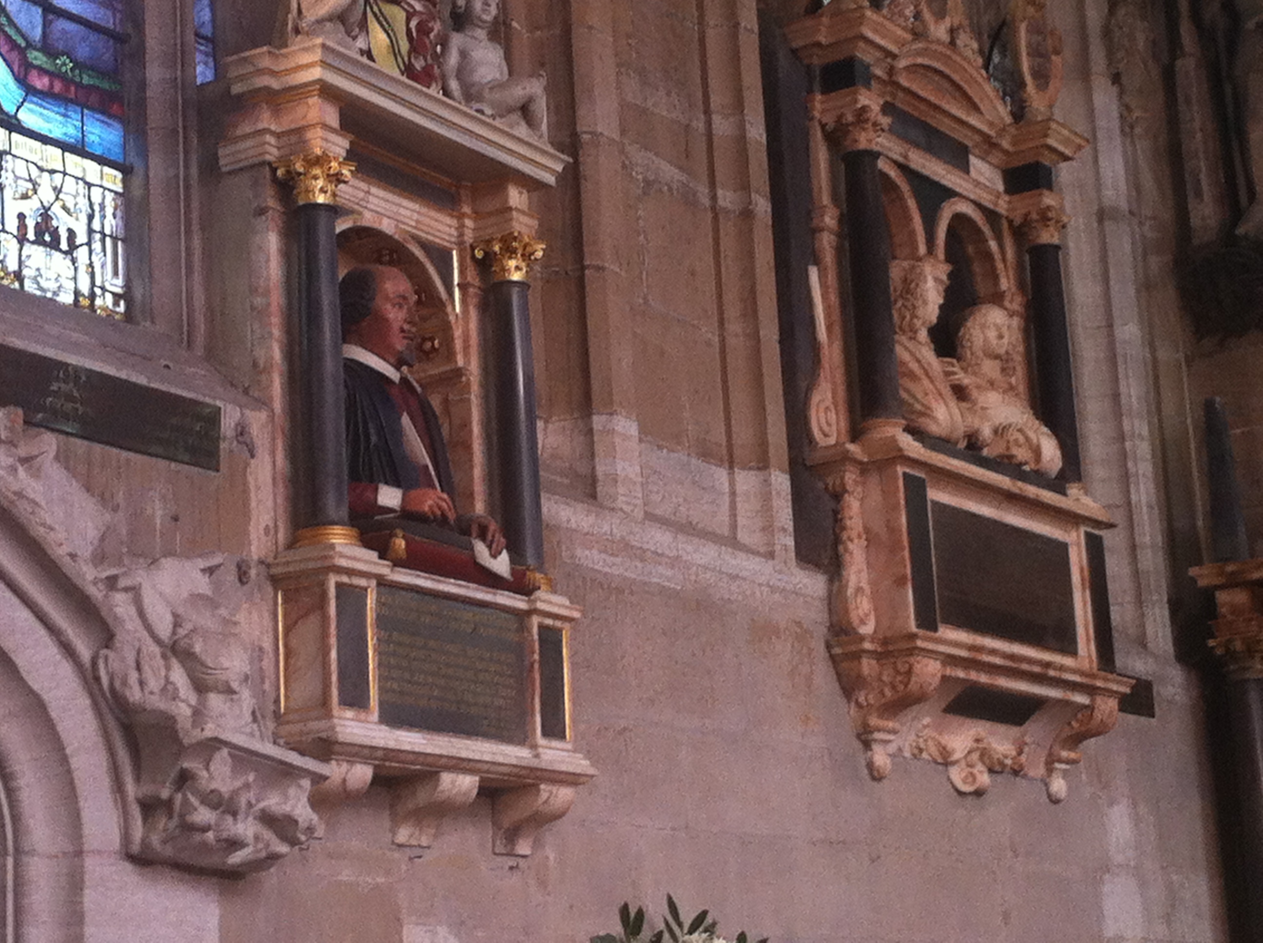 Shakespeare’s grave is interesting. He’s buried alongside some family members, but the order in which the bodies are arranged is strange. Shakespeare lies between Anne Hathaway and Thomas Quiney, husband to Shakespeare’s daughter Judith. Beside Quiney is Suzanna’s husband, followed by Suzanna. Where Judith and Hamnet are buried, I’m not entirely sure. At the head of Shakespeare’s grave is the famous quote warning people not to disturb his body, and above the graves, mounted on the wall, is the bust of Shakespeare that was notoriously whitewashed and then repainted, because someone is determined to prevent the world from knowing what old Will used to look like. (The bust had been painted and is supposed to have resembled him accurately, until it was whitewashed.)