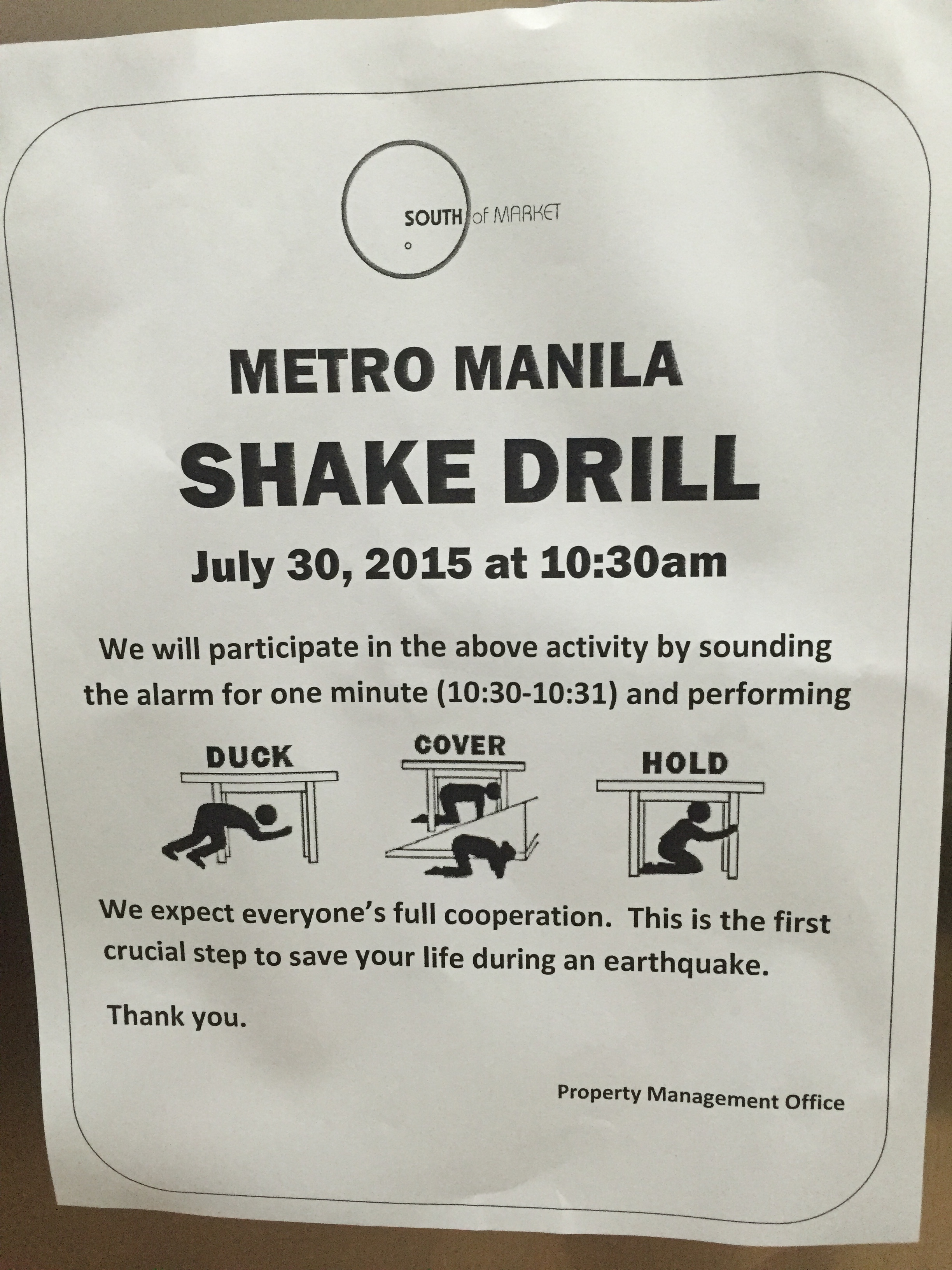 - Everyone here is worked up about earthquakes. They’re expecting The Big One. This means lots of signs for earthquake drills, including one in a lift that listed items you should keep in your earthquake survival kit. It was a weird list, with canned food, sleeping bags, goggles, and surgical gloves. (“For digging yourself out of a grave,” Sam suggested.) I’ve been told that my building is located on a fault line, and when I asked the director about this, he merely smirked and replied, “Well, it’s not exactly on the fault line.” Better go stock up on surgical gloves.