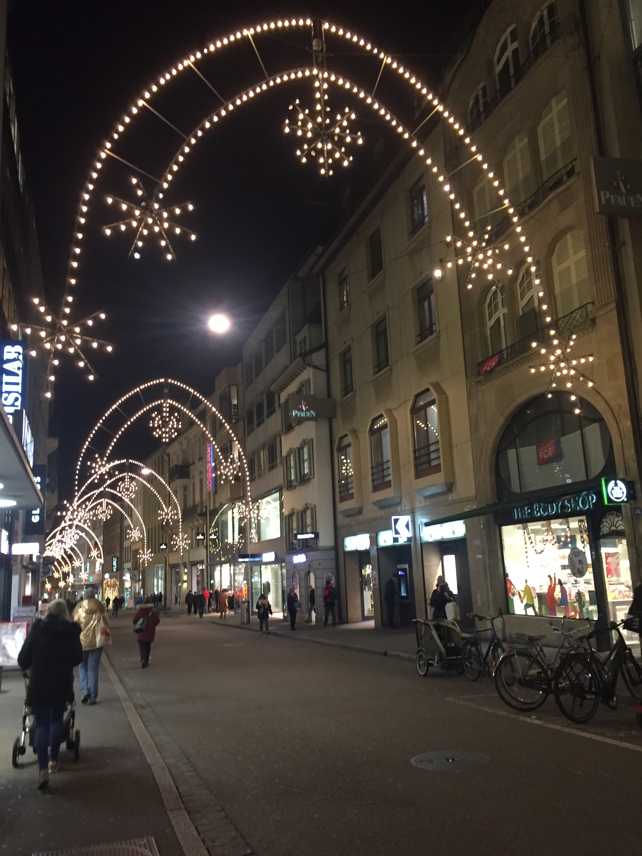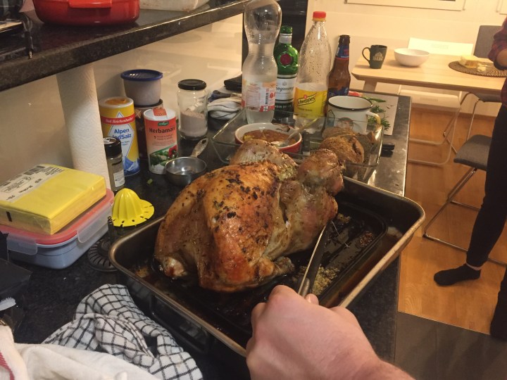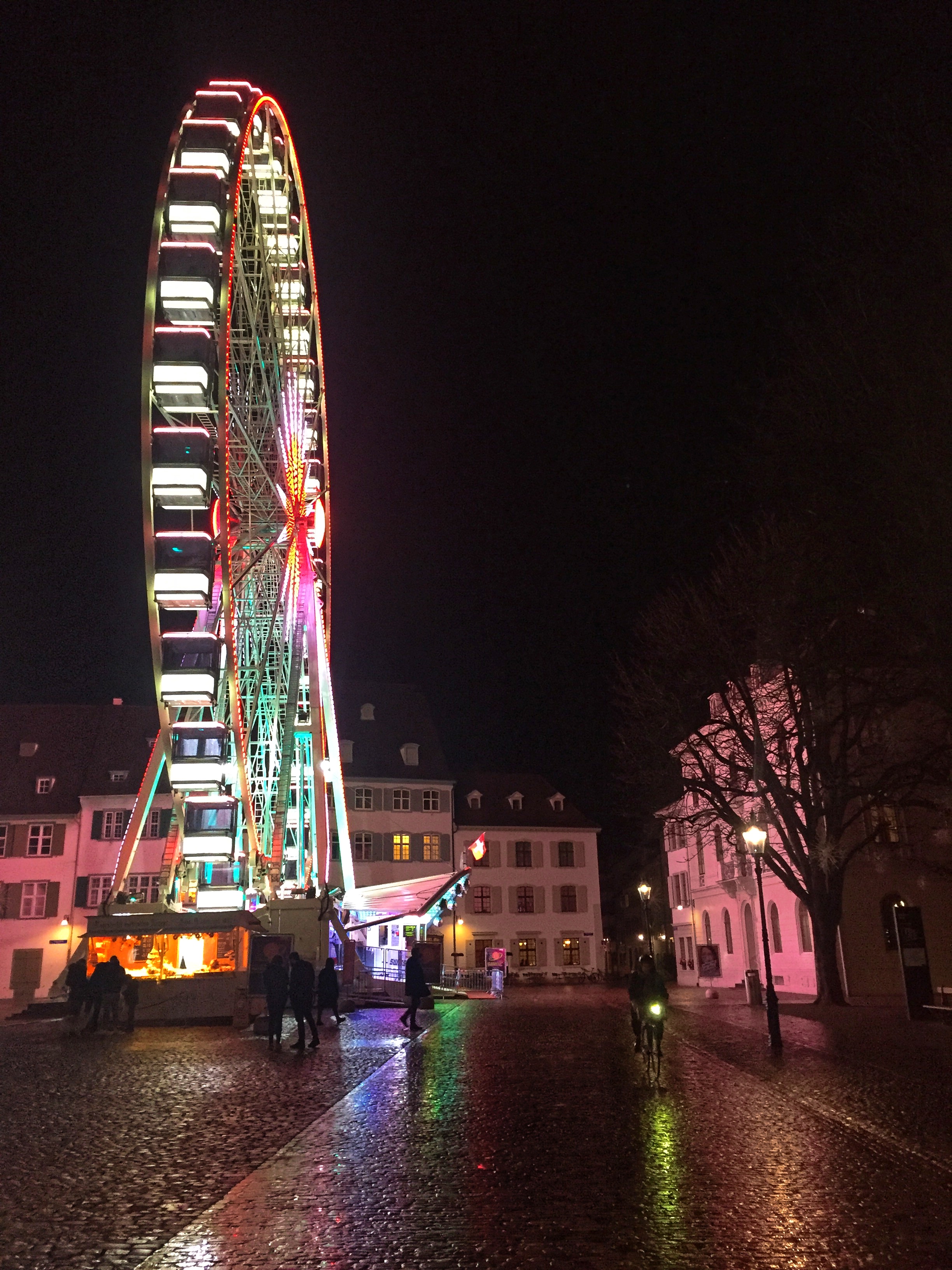 This is the thing about Basel. All of my kitschy holiday dreams come true here. It’s like living in Hogwarts and walking past the Room of Requirement every day and finding what you’re looking for. On Halloween, I walk past and – it’s creepy fog weather! On Thanksgiving Eve, I have a turkey in my bicycle basket, wedged between three baguettes and a grocery bag of cranberries and wine, and on Thanksgiving, it’s golden and delicious and I’m eating it with three amazing people, Sam Adams, and a slew of vegan sides. In December, there is snow, a giant Ferris Wheel, Christmas lights, and gluhwein.