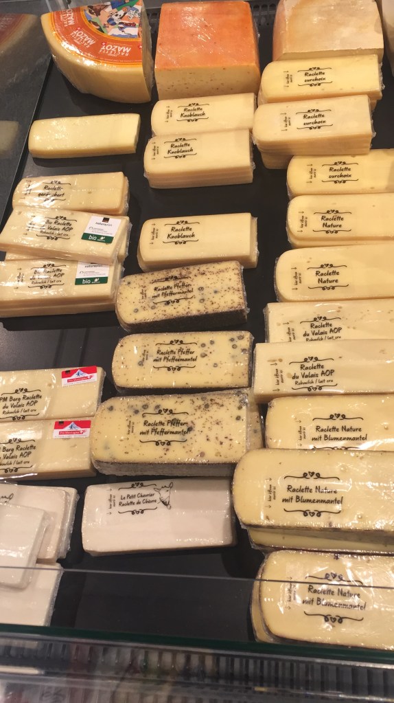 I had never tried raclette before, but Christine and Jen had been talking about it in the faculty room so I knew we had to give it a go. I spent a good hour in the local Coop comparing cheeses, searching for pickled onions and little gherkins. Christine was my raclette guru, guiding me through the store via WhatsApp. Without her, I would not have discovered herb butter (krauterbutter), the fact that pickles and onions can live in one jar together, or that garlic cheese and pepper cheese are better options than your typical creamy cheese. From Jen, I was steered toward the Fendant wine from Valais, which I’m told is made for raclette but must not be served too cold or it will harden the cheese in your stomach.
