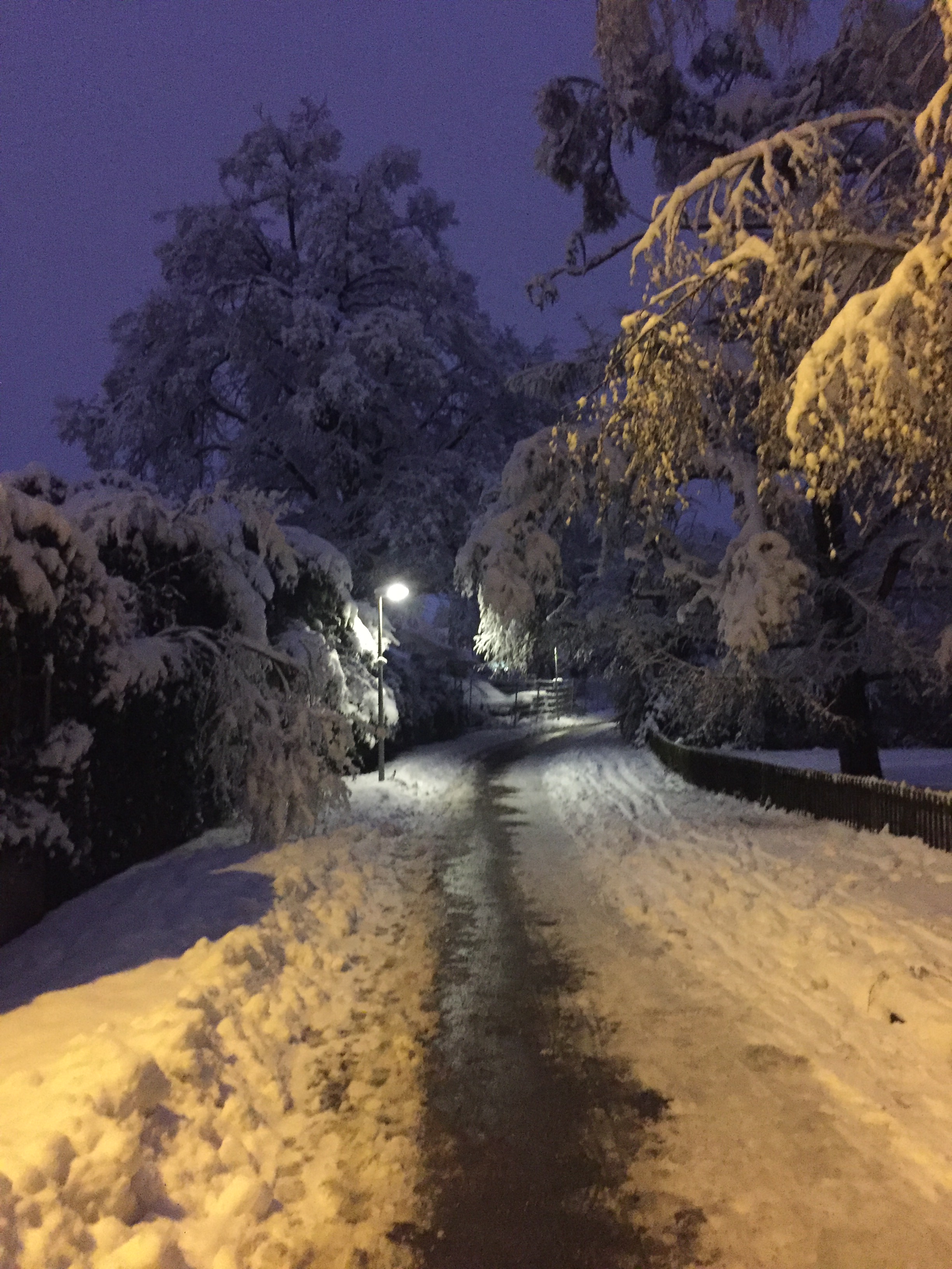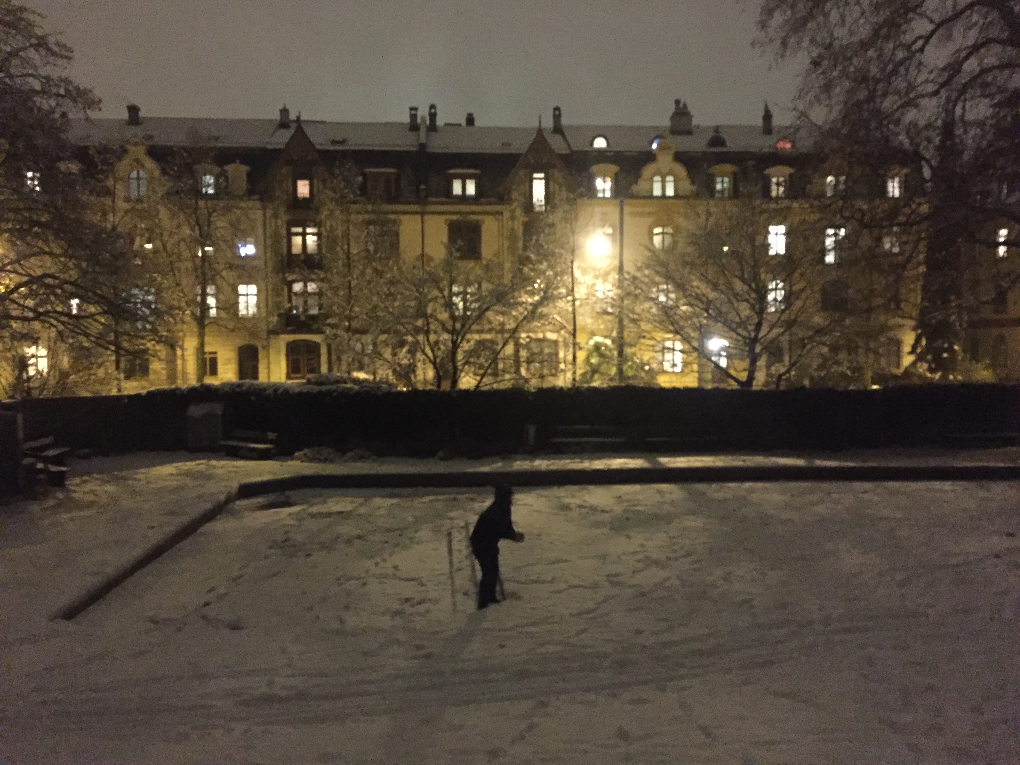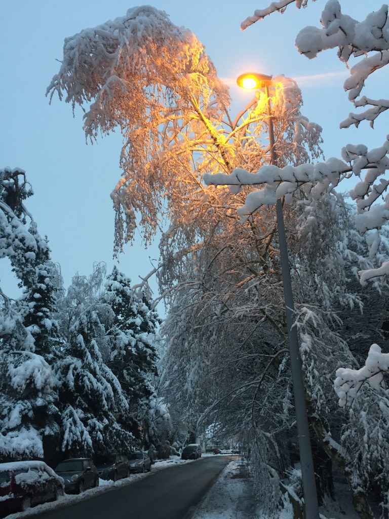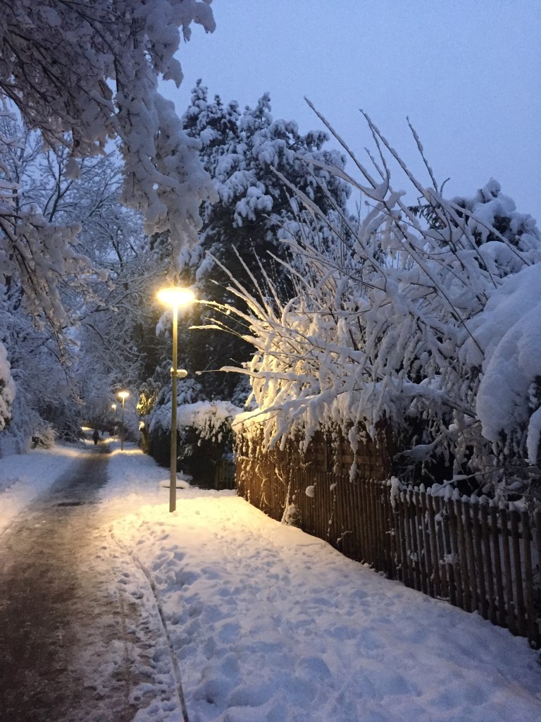 It was the best walk ever: snow crunching under my boots; the roar around every corner that sounded like a plow but turned out to be parents pulling children on wooden sleds; the sharp scent of pine; the soft glow of street lamps; the empty benches piled with snow; the way the sky faded from lavender to rose to the amber glow of from city lights; warm kitchen windows; a woman holding her baby, in a striped onesie, at the window and the baby pointing at snowy bushes outside; two older woman carrying skis twice their size to who-knows-where; a child hauling a sled up a hill by himself, cruising down the promenade where we normally ride our bikes home from school; children shrieking and throwing snowballs until one of them starts crying; a snowman in an apartment complex courtyard with a little straw hat and a scarf; another snowman in another complex with brooms for arms, draped in battery-powered white Christmas lights; a woman pushing her mummified little baby along the sidewalk, the baby doing that thing where you hum as you go over bumps.