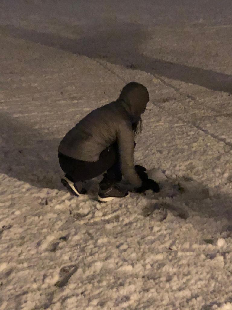 The park is huge, so there was plenty of space to fling icy snowballs, to build a little snowman, to climb on abandoned and snow-covered playground equipment. And it was still. Snowing. Kids sledded down a nearby hill. A parent threw a snowball at their child from atop some playground equipment. A pram sat parked under a streetlight, quietly gathering snow.