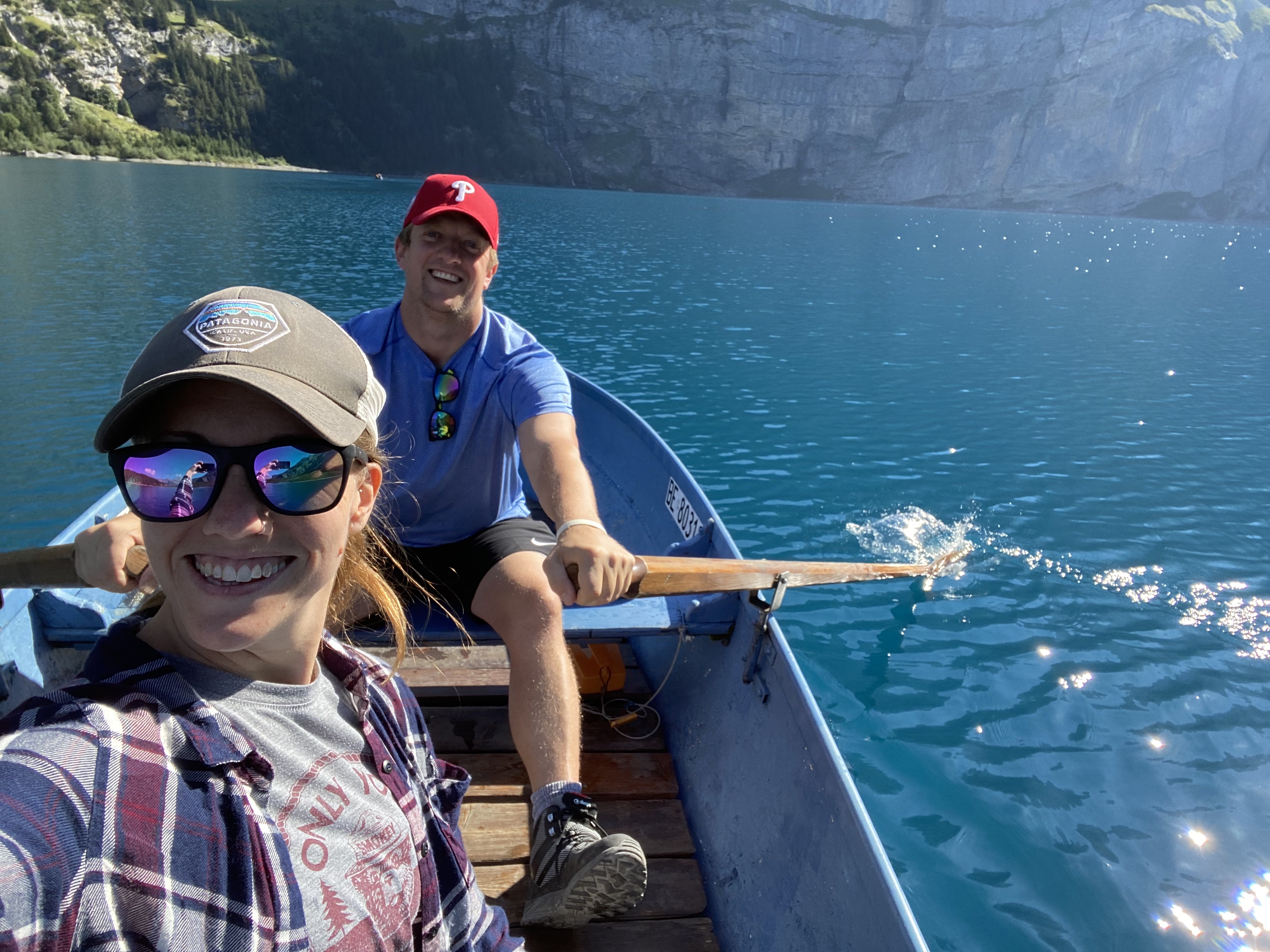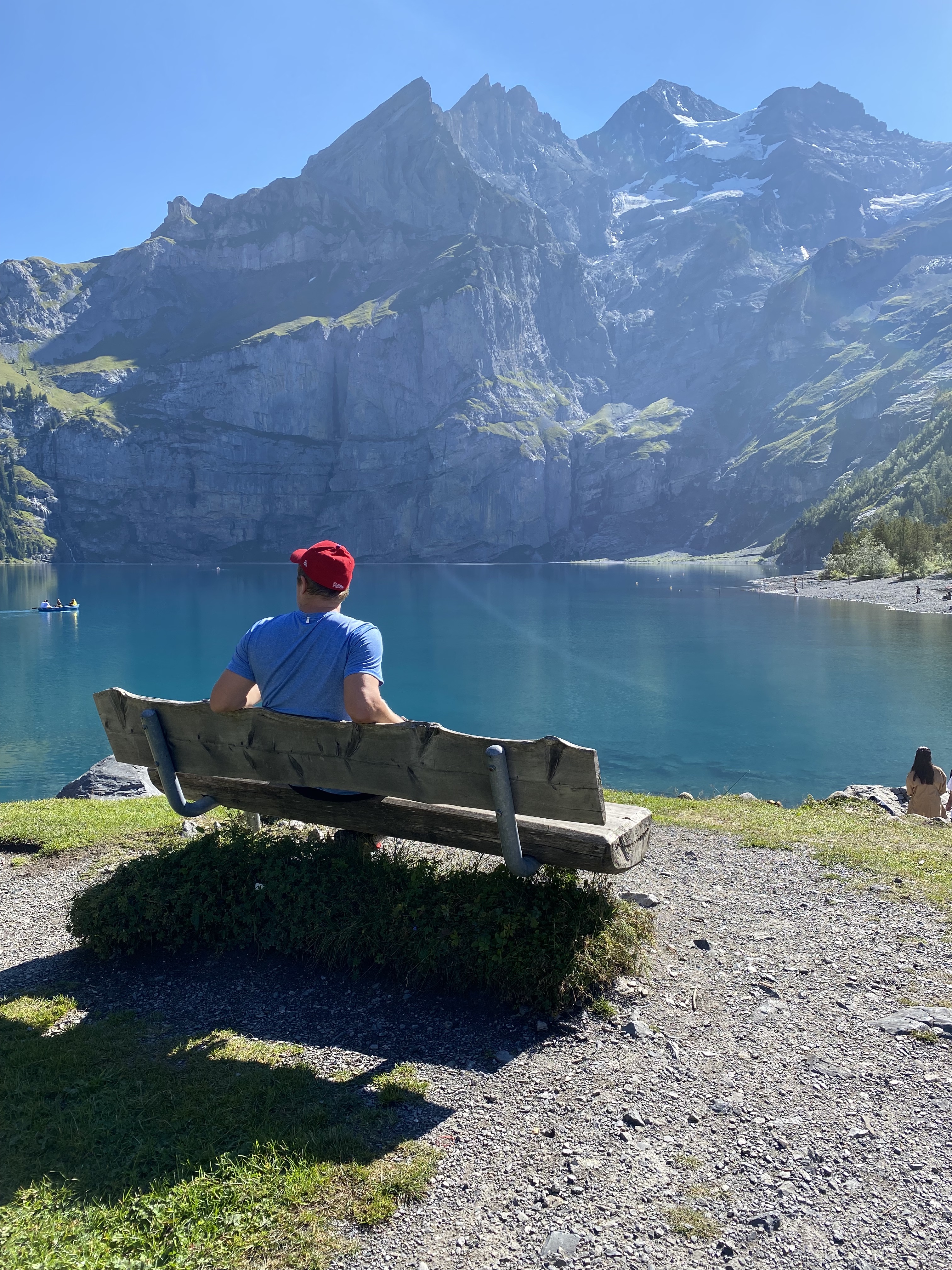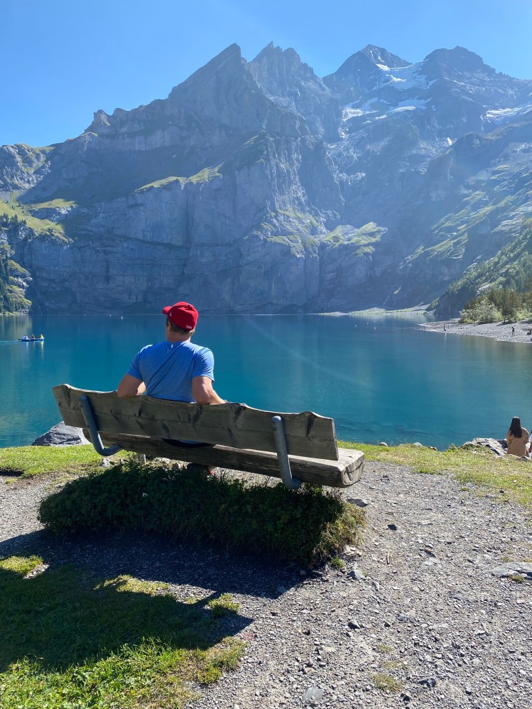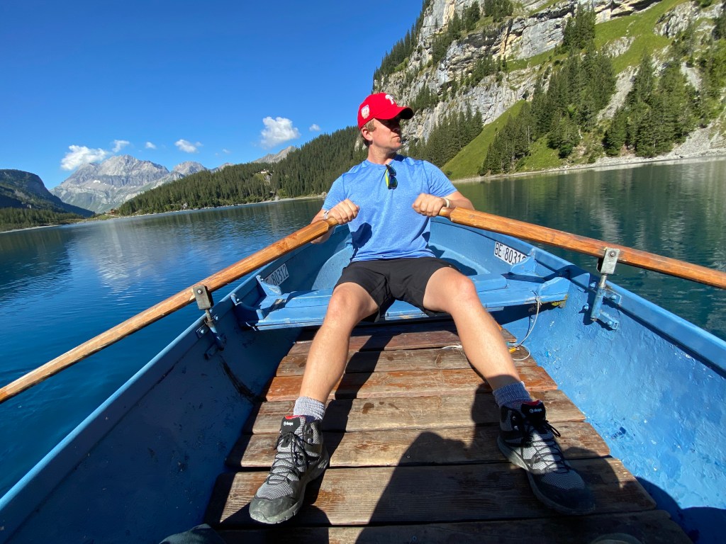 It’s only about a 20-minute walk to the lake, which was not swarming with people yet. We spotted a dock with a small kiosk by the water’s edge and decided to rent a rowboat for about 28 francs an hour. Dan insisted on rowing – really, I offered – while I snapped no less than a million photos of the lake and surrounding mountains. Unfortunately, there is no camera or word in the English language to truly capture the blue-green of the lake. Trailing my hand through the water, it was remarkably clear. It reminded me a little of Silfra in Iceland, where divers and snorkelers flocked to swim between continental plates and glimpse something like 100m of visibility. Oescheninsee was perfection. My only regret is not having packed a swimsuit.