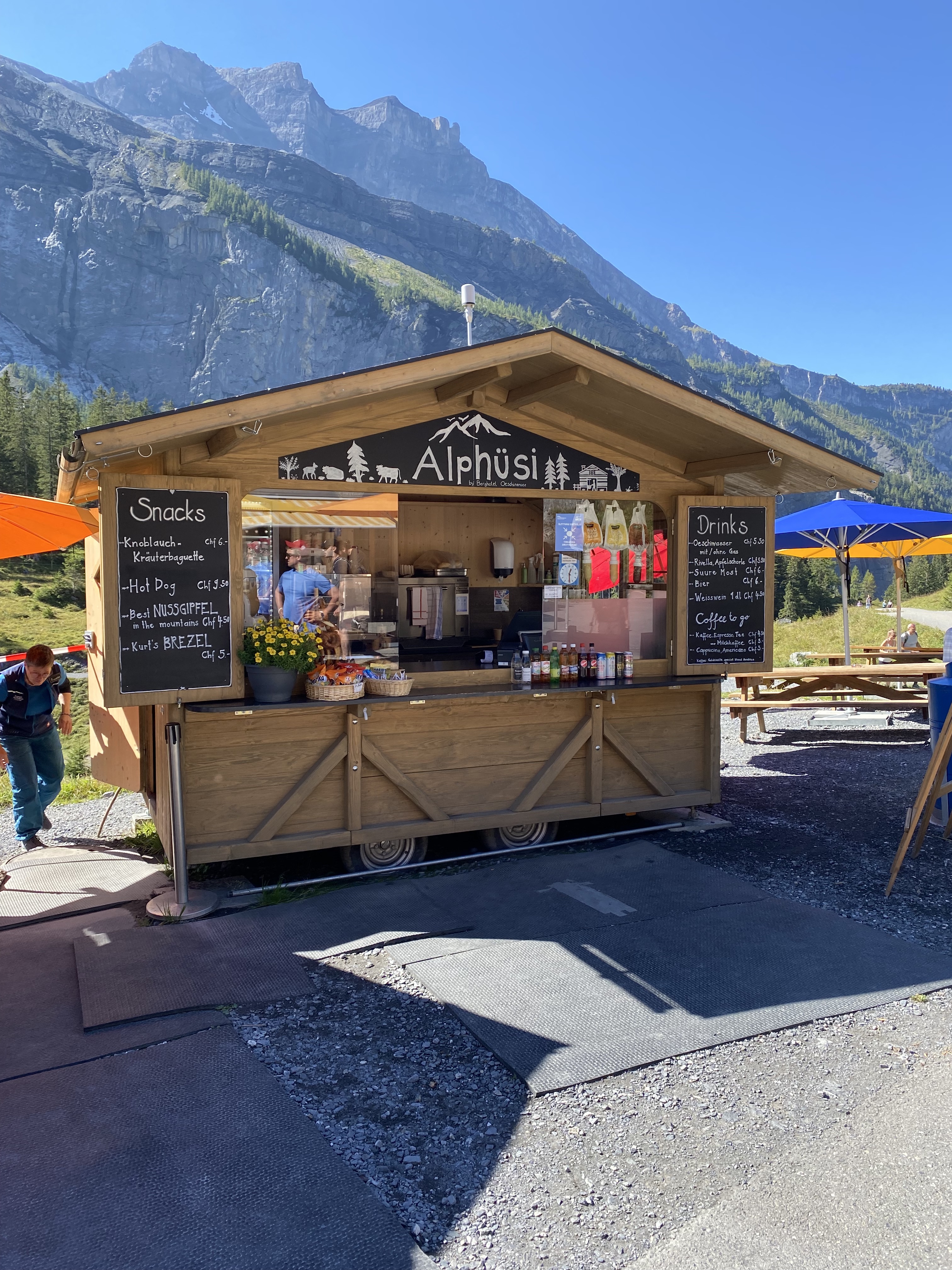 In the morning, we had a delicious breakfast (included, buffet style, plastic COVID-safe gloves to boot) before catching the cable car up to Oeschinensee. The cable car opens at 8:30am and comes with a discount if you stay at Belle Epoque Hotel Victoria or you have a half-tax/SwissPass. We’d been advised to forego the hike up the mountain as the views are apparently not amazing, so we rode for about 15 minutes in the cable car to a little restaurant near an Alpine slide (must try this next time). Two coffees later and we were on our way to Oeschinensee, a stunning lake created by glacier runoff.