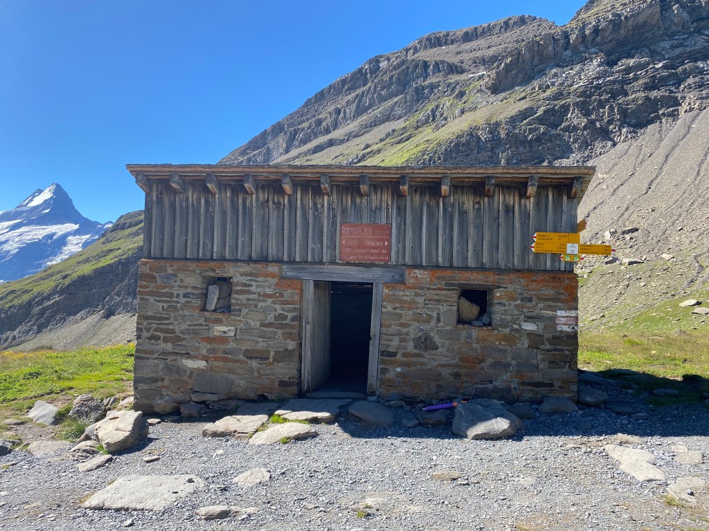 The hike up Faulhorn took me about an hour. A ways behind me were two men with hiking poles and bright shirts. Ahead, there were two others. A third of the way into the climb, there was a hut, which did not have water. Still, I paused briefly in the shade and said hello to the men in front of me, two folks with British accents who were older-looking. I passed them and continued up to the next hut, which was really just an empty stone structure.