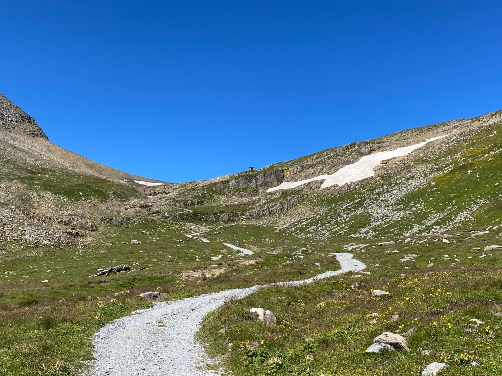 I left Bachalpsee at 9:30, sweaty and parched. I’d hoped there would be drinking water there, but a fountain near the bathroom bore the sad phrase “kein trinkwasser”, meaning not drinkable water. As I stood there debating, a camper – a small group had clearly spent the night and were making breakfast in front of their tent – approached with two large canteens and filled them. I still had a little left in my canteen and debated topping up – when in Rome, right? – but in the end, I decided not to mess with that. Who needs a bad belly halfway up a mountain? Not this gal.