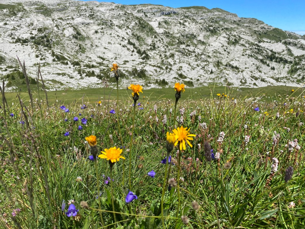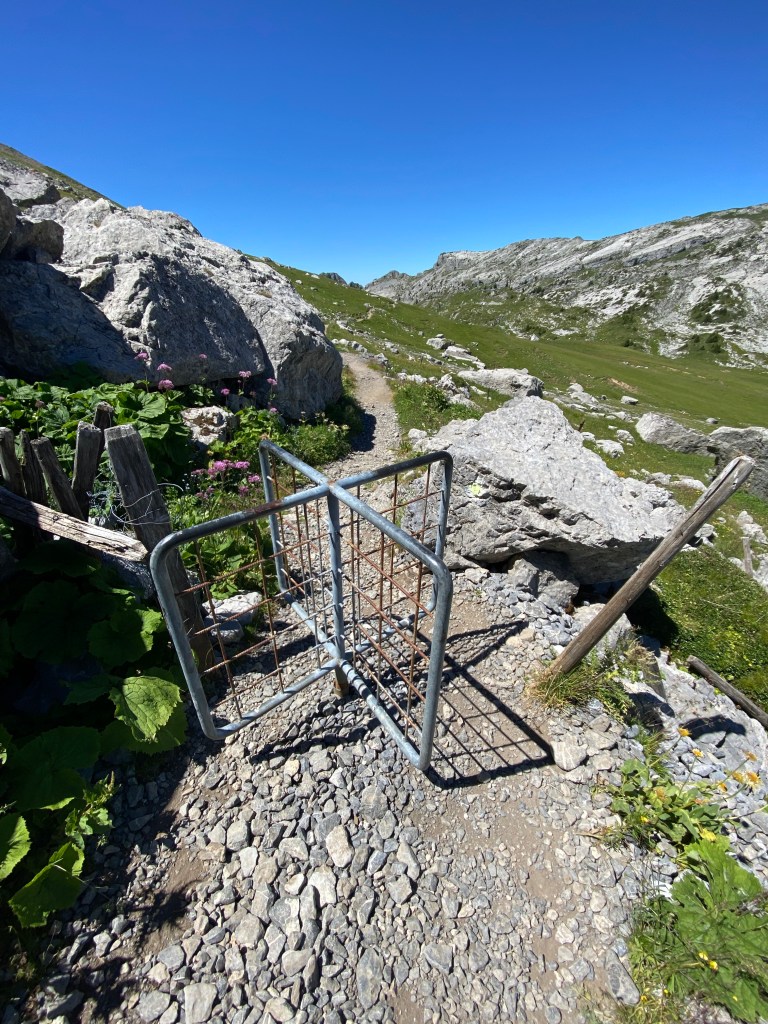 I opted for the Oberberghorn route, which involved another hike uphill which was totally worth it. To my left, meadows sprinkled with purples and vibrant yellows, oxeye daisies and funky Dr. Seussian Easterflowers. Tall stalks of gentian, meadow foxtail, harebells – the meadows were alive with color, a sea of tall grass sparkling with color. Suddenly, I felt a burning pain on my right shin, inside my hiking boot.