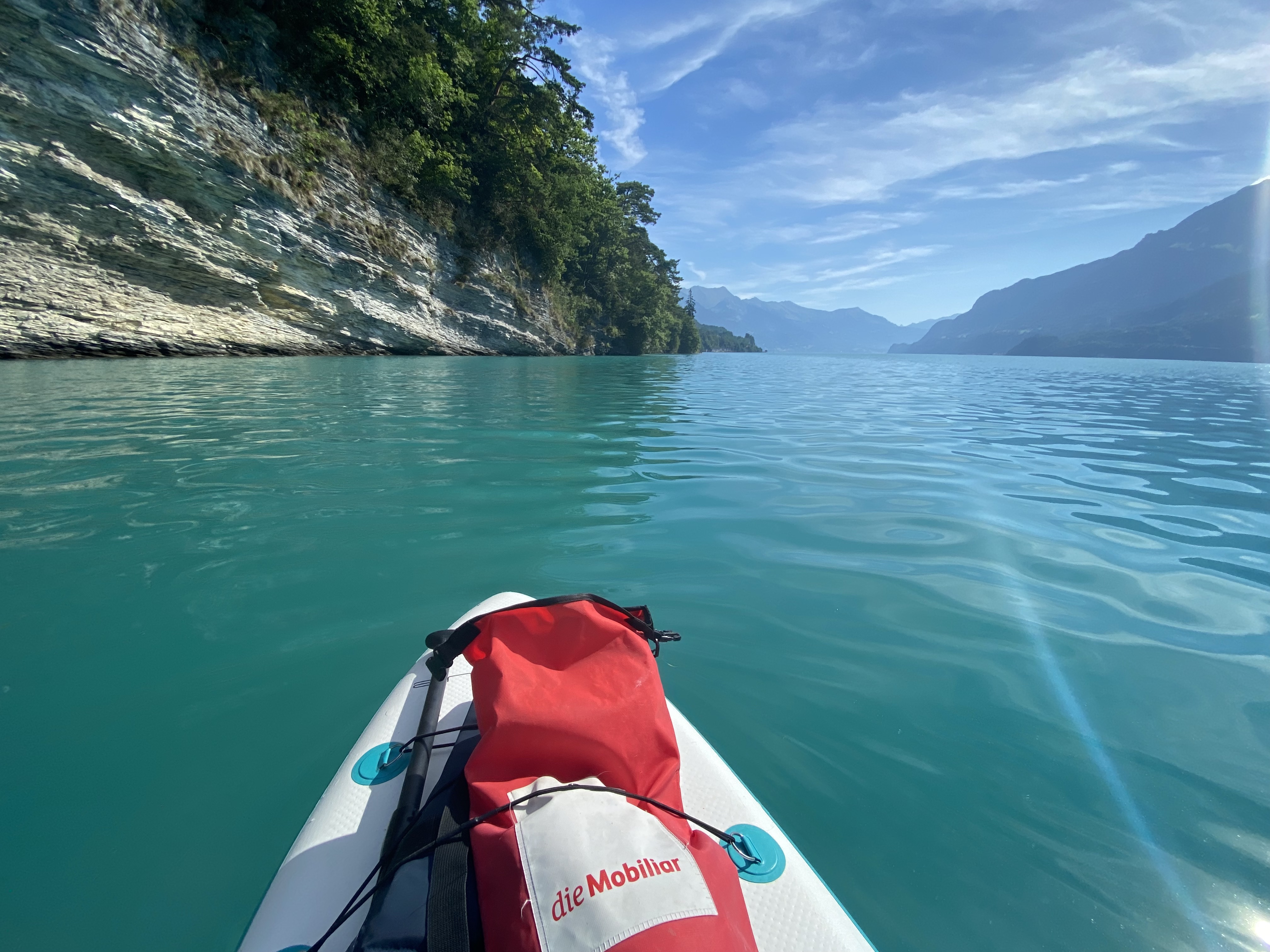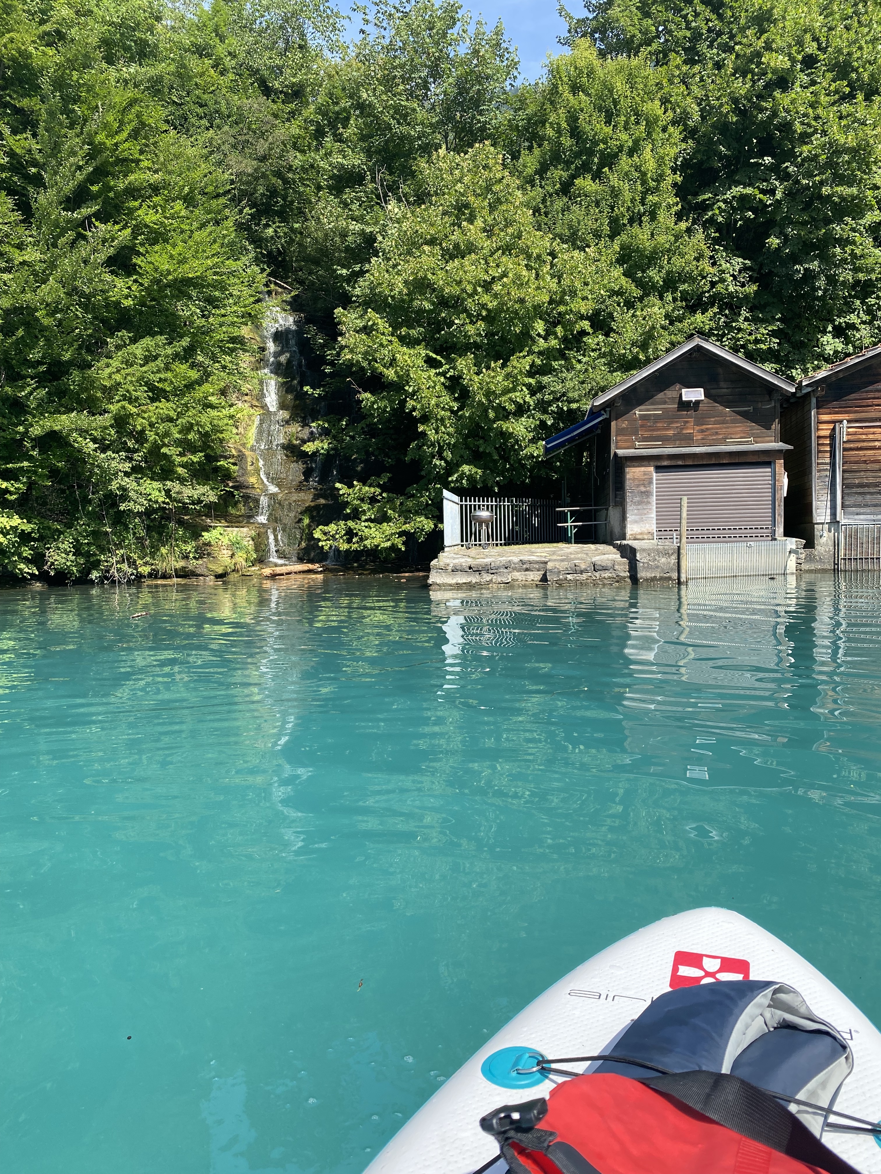 Between sips of Chardonnay last night, I Googled paddleboard rentals along Lake Brienz and found a place in Bönigen that rents boards at affordable rates. (Some other places offered, but prices were more expensive.) SUP Fit & Fun also provided a WhatsApp number and email address to contact about rentals, so I sent an email around 8pm on Wednesday evening. Not an hour later, I received a reply – sure, I could rent a board. Would 9:30am work?