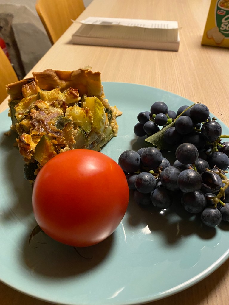 I eventually said yes, and he returned with a plate of heaping courgette pie, grapes he picked from the side of his house, and three apples.