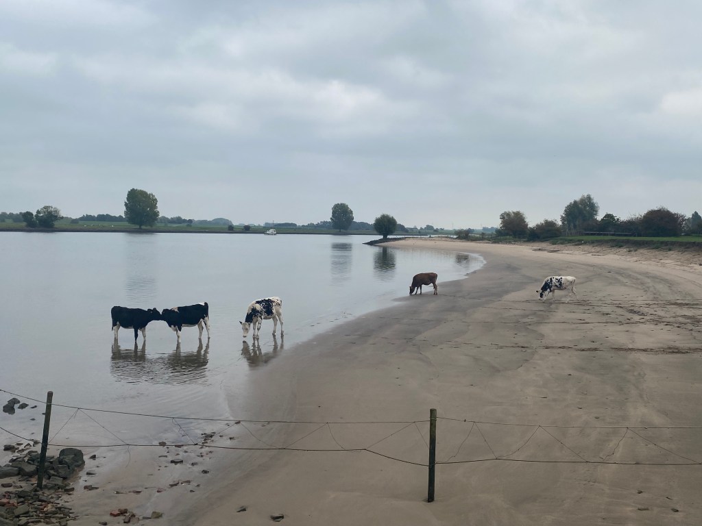 For a while, they spoke in Dutch and I looked on. Five cows came to the edge of the pasture and ran down the sandy slope to the riverbank, where they waded in and drank from the water. I have never seen cows in the water before.