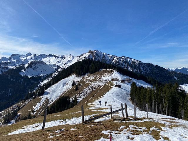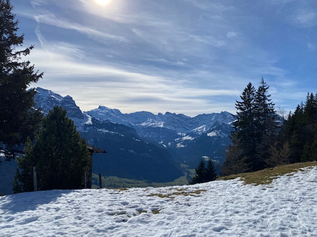 Still, it was a nice day. I wore my underarmor top and a puffy vest, hiking pants, hiking socks, and a pair of gloves, though the gloves came off after about 30 minutes. I’d packed along an extra pair of long underwear, socks, two long-sleeve shirts, and a down jacket in my backpack, and didn’t need any of them. While it was comfortable and enjoyable to hike in the sunshine, never feeling cold or uncomfortable, I worried a little about whether this is normal for Switzerland: so little snow, not very cold, and in the middle of February.
