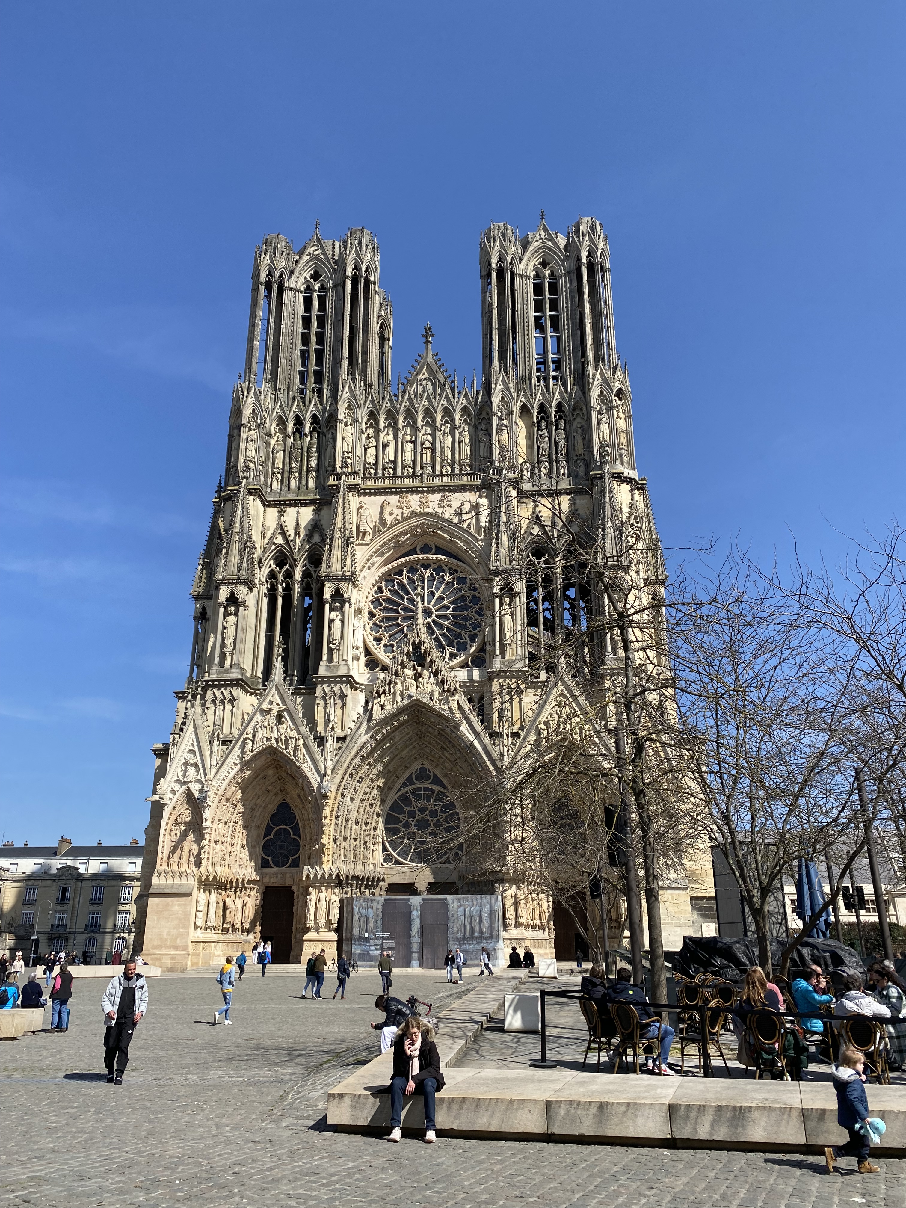 Dan took on the burden of getting us through the roundabout, which he did superbly, and parked us on a side street just a little outside of Reims. From there, we headed into town to explore the Notre Dame cathedral – absolutely enormous, with scars from World War 1 and stained glass windows from Marc Chagall. Inside, it was as so many other cathedrals: drafty and beautiful. Craning to look up at the ceiling, one can easily imagine they are standing there in 1275, the year the cathedral opened, or watching Joan of Arc saunter through the doors or Charles the X have a crown set on his head, or hear the shells and firing echo all around from World War 1. It’s the one thing that always gets me when I’m traveling outside of the US: everything else in the world seems so incredibly old, or maybe the US just feels young in comparison, a rebellious teenager breaking curfew and bingeing Chick-Fil-A and blowing things up just because, while the older generation of the world looks down across the generational chasm without comprehension.