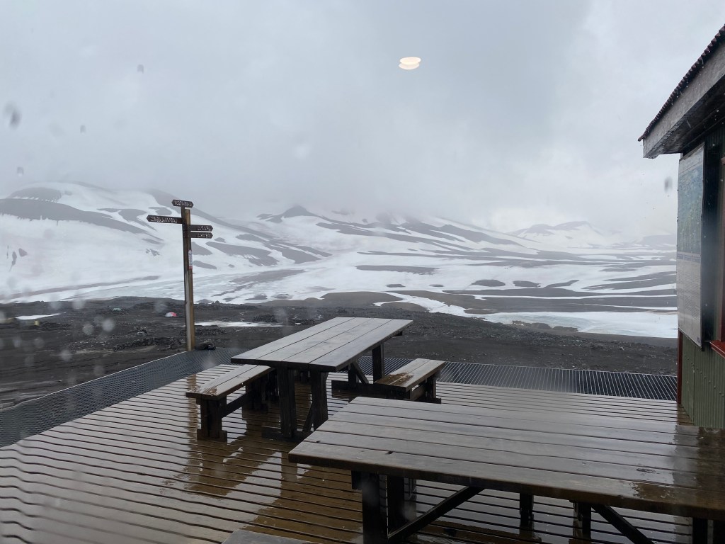 We laced up our hiking boots and headed on, emerging just on a hill overlooking the huts at Álftavatn. We checked in at the warden’s hut at 10:30am. Check-in is normally at noon, but the warden was probably there for check-out, which is until 10:00am. Excited to have beaten the weather – and remained dry! – Mel and I ordered a beer, a Pepsi, and a Snickers bar to celebrate.