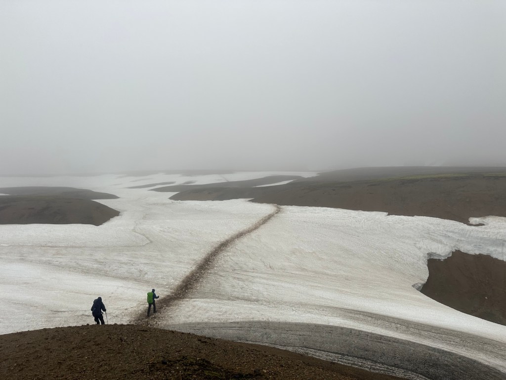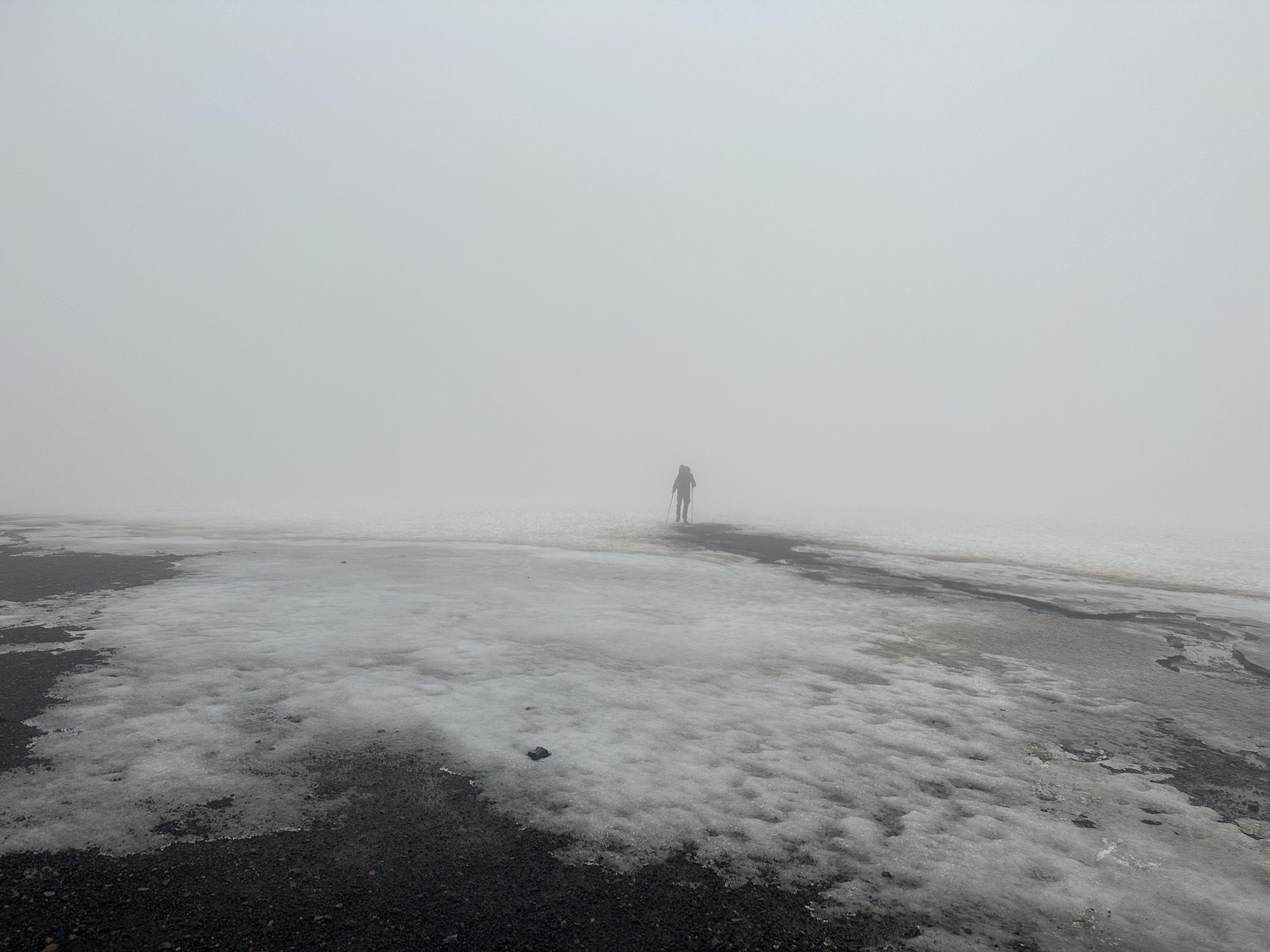 The Dutch men were also up and behind us a short way, so we felt bolstered by the fact that we were not alone. Every so often, we’d stop at the top of a snow ridge and scan the fog for a post.