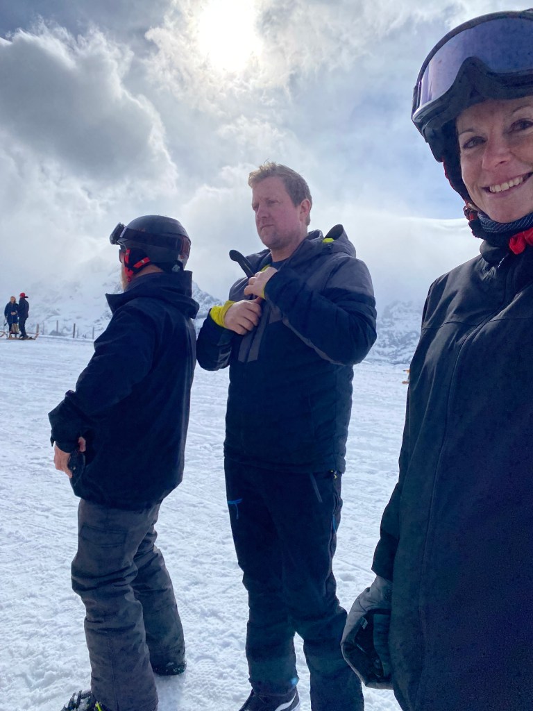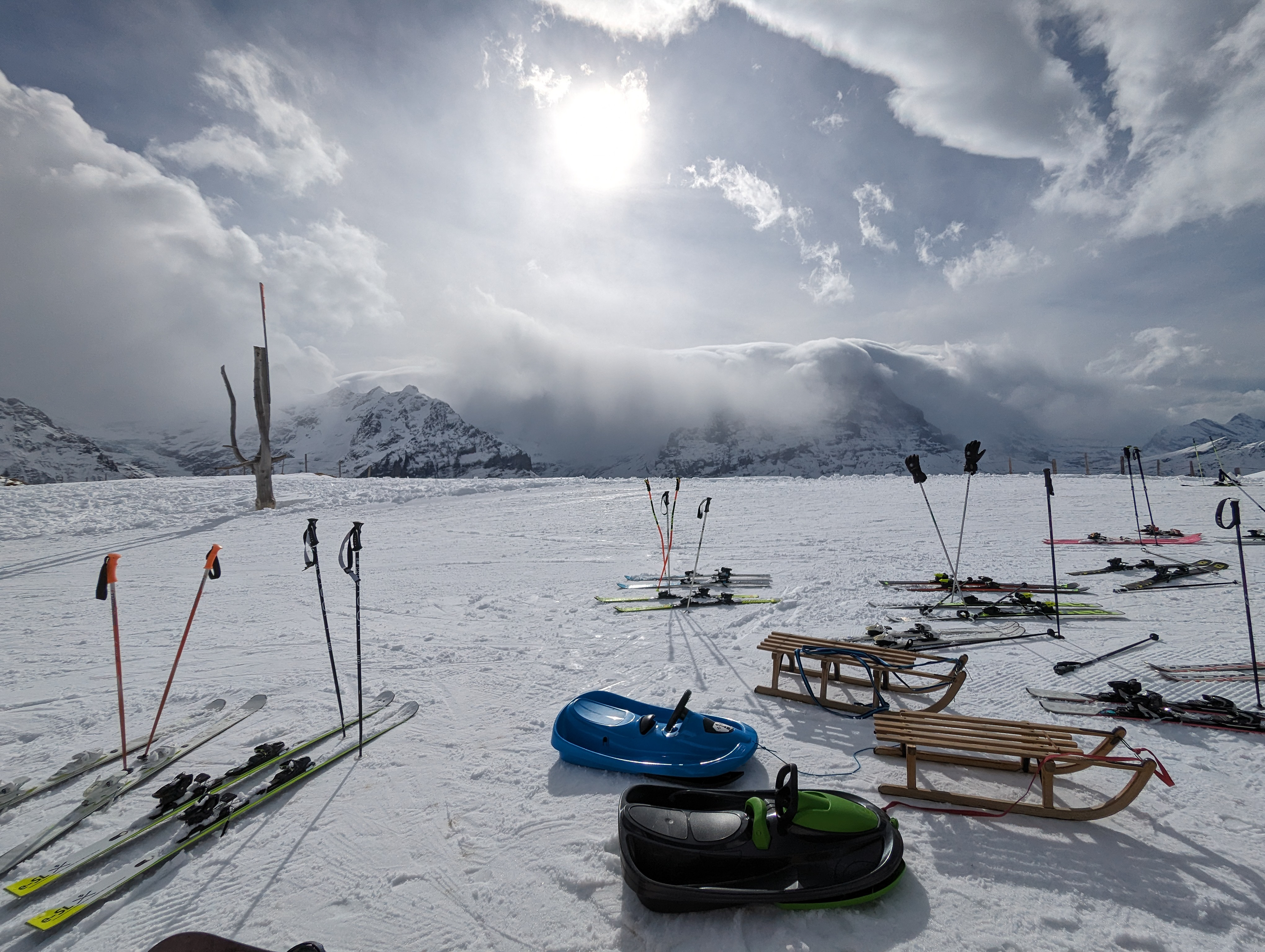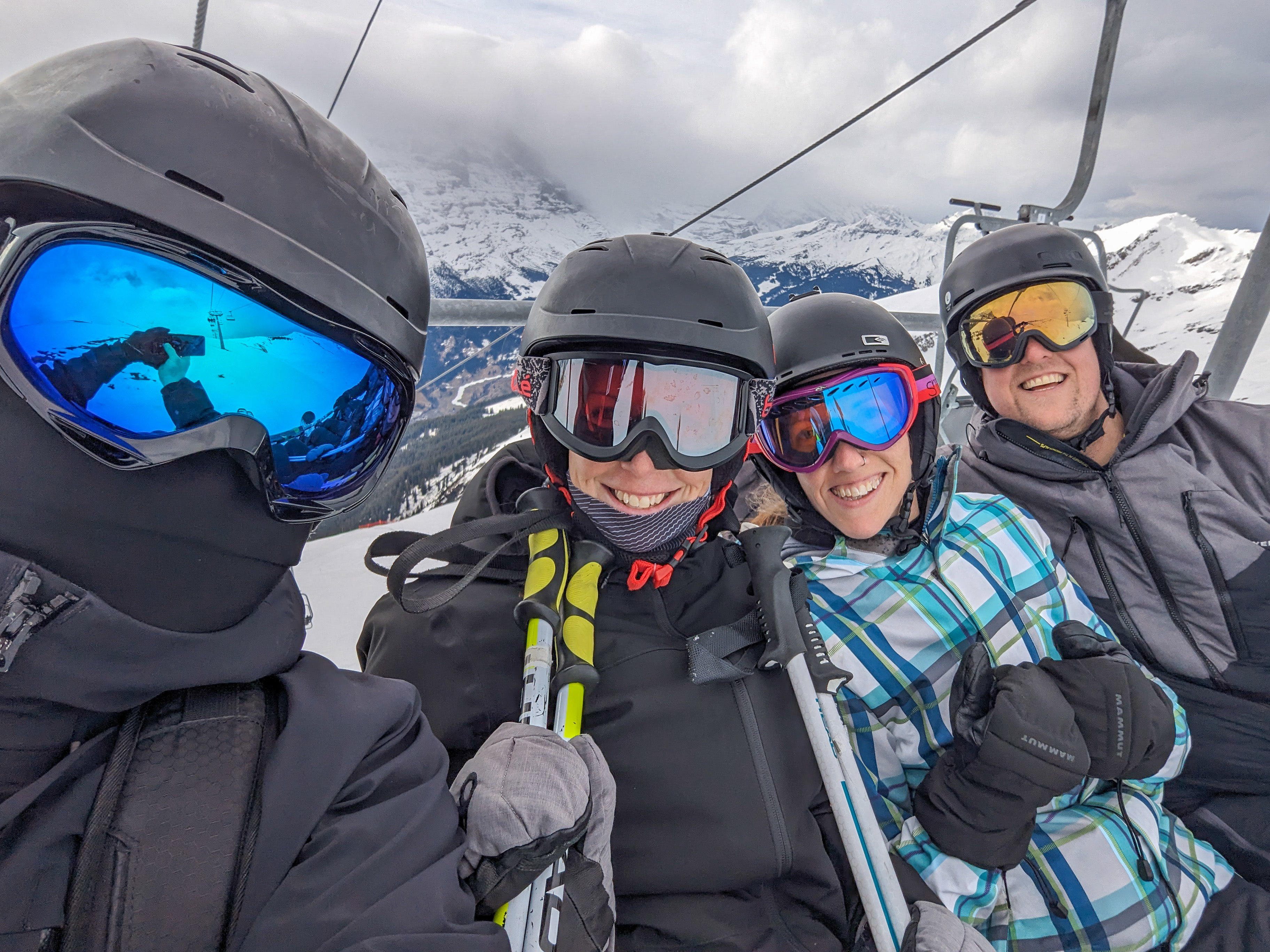 The first time Dan ever snowboarded in Switzerland was here in Grindelwald in January of 2021, when we traveled up with Rebecca and J and stayed in their apartment. I never blogged about it because it was during COVID and most European resorts had closed due to the pandemic. All of Europe was watching Switzerland with undisguised loathing as Switzerland, not part of the EU, kept its resorts open. I felt guilty enjoying empty runs with my friends while people all over were locked down. All of this to say, Dan was spoiled for his first time snowboarding because there had been no one around. (We also went up to Jungfraujoch, the “Top of Europe”, and there was no one there, either, except for a watch salesman.)