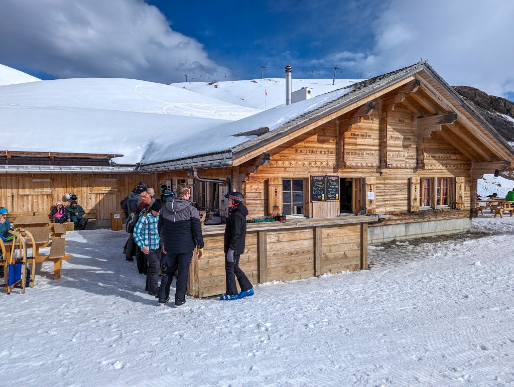 What a day, though. It was sunny, there was snow on the ground, and even if it was a little slushy, it was a joy. Dan suggested Adi’s for lunch, a wooden hut you kind of have to know is there because it’s a little tucked away. It was a great suggestion because it wasn’t crowded. We got seats outside at a picnic table, basking in the sunshine and listening to a range of music from ABBA to traditional Irish to techno Swiss yodeling.