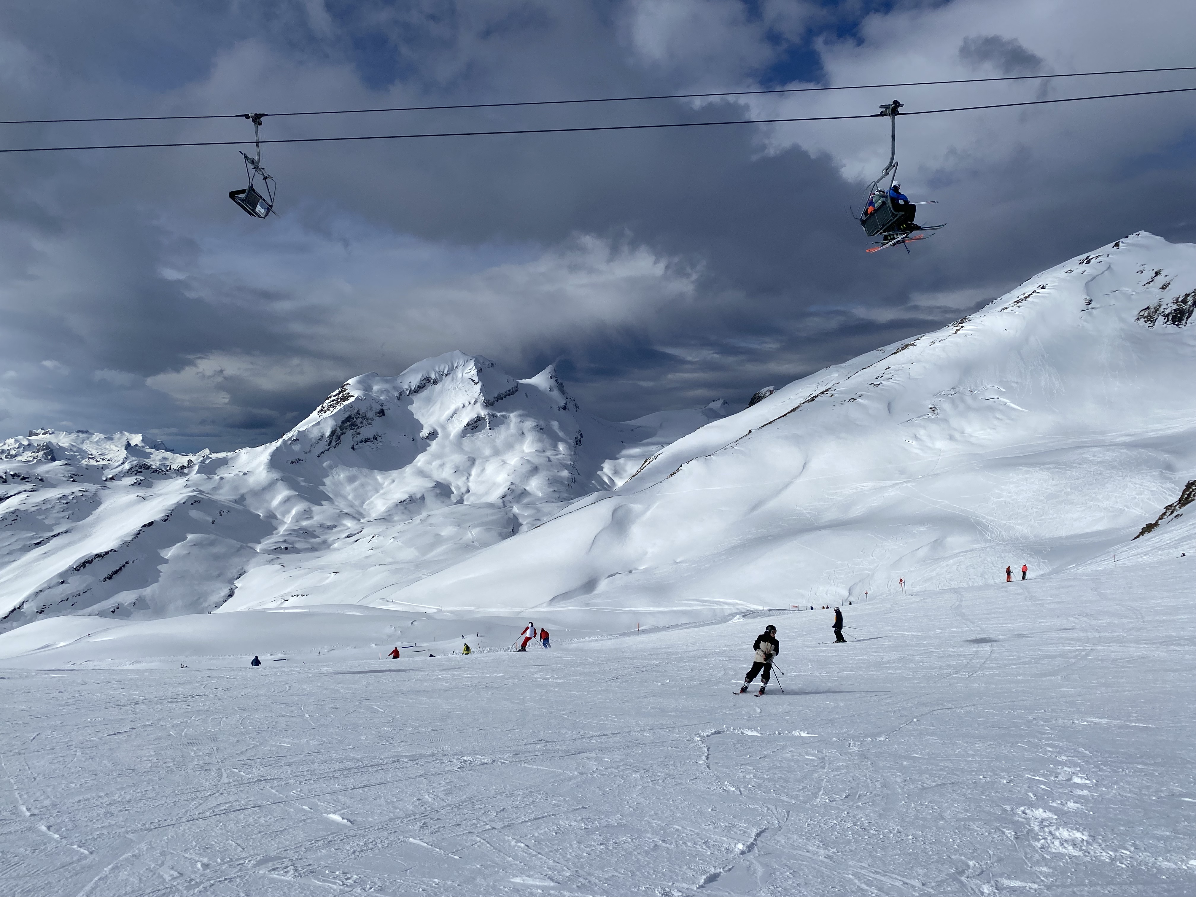 Kelly and Michael were faster and more adept at the blues and ended up taking one, the 22, all the way back down to Terminal. Dan and I scoured our map and tried multiple chairlifts, but no matter what we tried, we always ended up in the same place, like some kind of unforgiving video game maze. I was getting frustrated – less than ideal conditions, lots of narrow downhills where you had to get speed and keep it before the trail curved uphill, lots of people whizzing past or pizza-french-frying slowly ahead, a downed skier who looked in quite a bit of pain – and so was Dan. The best moment on our run was choosing a red rather than the narrow blue just before the chairlift, where along the piste on the sides was beautiful, powdery snow. Fed up with the rocky ice of the piste, I rode alongside it in the powder instead. It was a few very welcome seconds of joy. (Note to self: the Arven ski area is meh, as is the 22 along the Arven ski area, the 25, and the 26.)
