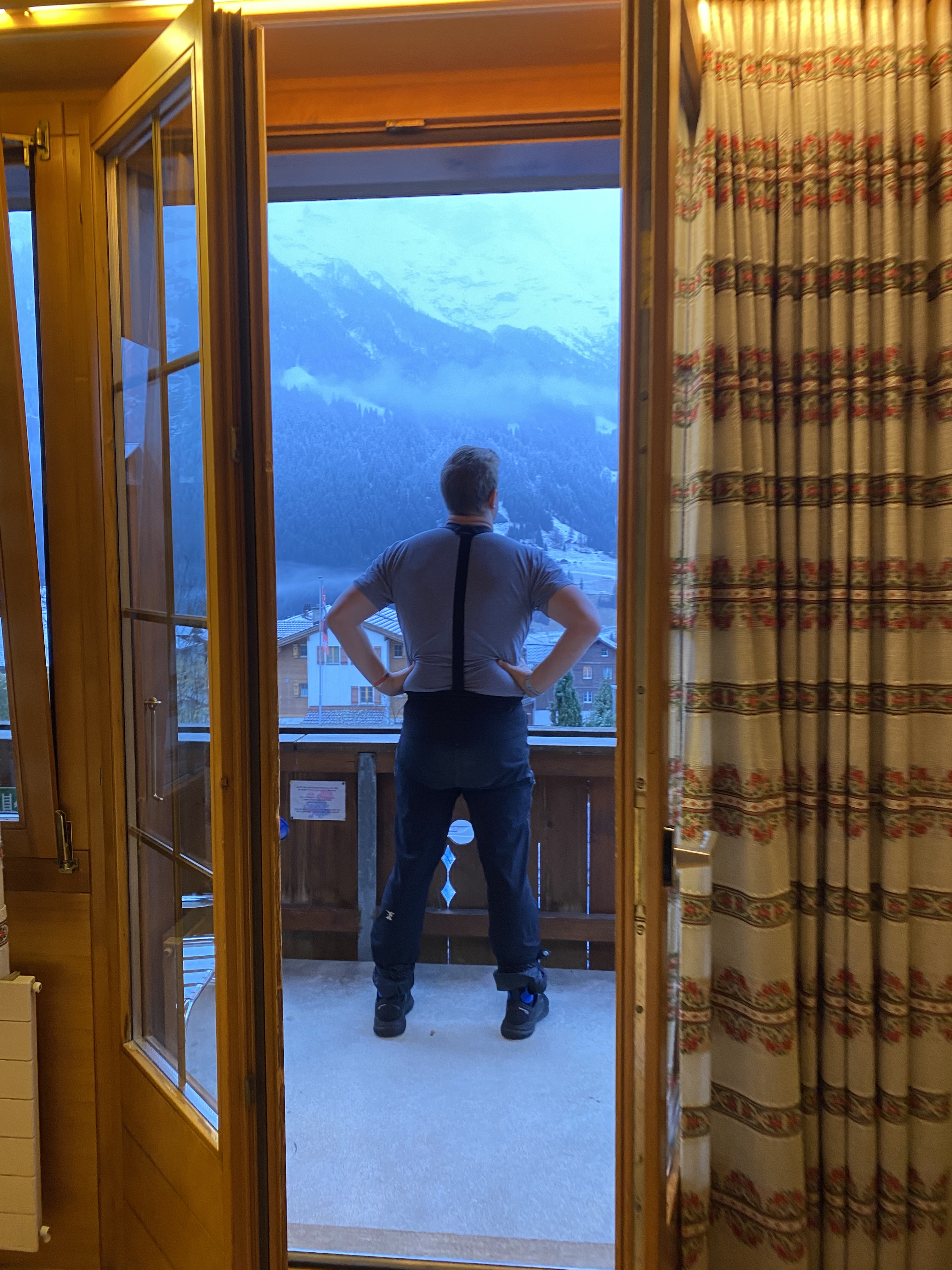 The weather was depressingly warm for February. I left Basel wearing a sweater and jeans and unpacked our car at Hotel Alpenhof wearing a sweater and jeans. Grindelwald valley was a concerning shade of green, though the towering rock face of the Eiger visible from our balcony showed stripes of snow near the top. My trusty app promised snowy slopes and open lifts, even if the balmy valley temperature suggested we might be nuts to go skiing this weekend. The woman at the front desk reported good conditions based on feedback from hotel guests.