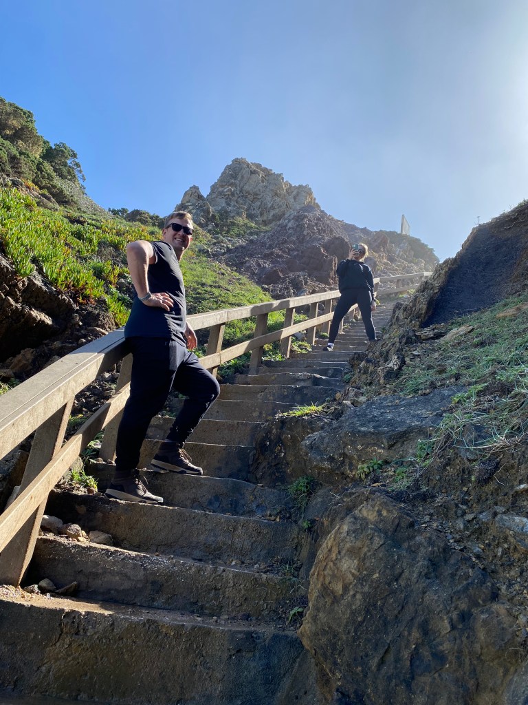 I laced up my running shoes and stopped by the front desk on my way out to ask how to get up the cliffs. Google Maps is not helpful for running, often mapping me a route alongside a highway with no sidewalk. He explained that there were two options to get up: a set of stairs across the street on the left, which might be closed, and a set of stairs at the end of the beach that were definitely closed, but I should be able to go up them anyway. He explained that some recent rockfall led to the stairs being closed, with warnings posted about fines for anyone who climbs them.