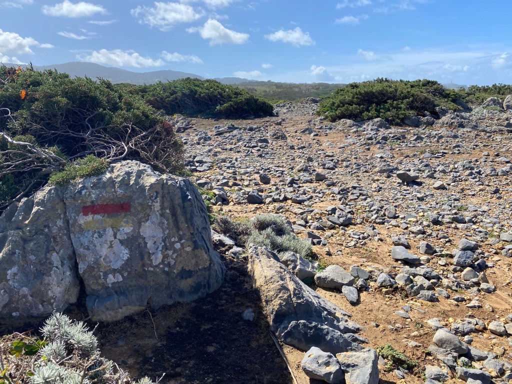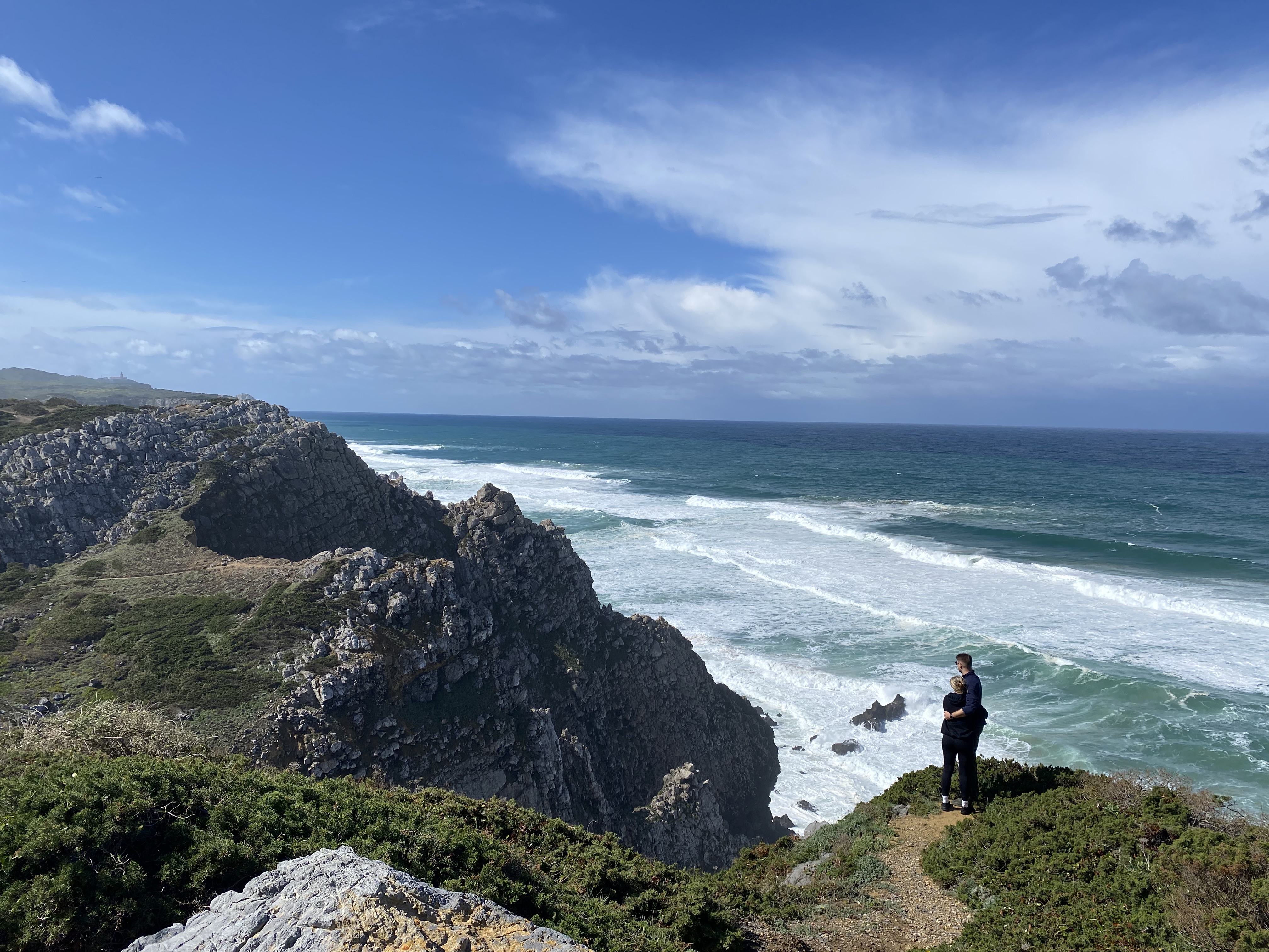 We emerged at the cliffside and the views had the same awe-inspiring impact on everyone. A Swiss man and his wife were down by the cement marker, flying a drone, which got J talking (he’d brought along his drone, but had read that you needed to register it to fly it in Portugal). After several minutes admiring the views and snapping photos, we headed back the way we came. We passed more people on the hiking path, and to my dismay, I spotted dozens more climbing up the illegal beach stairs!