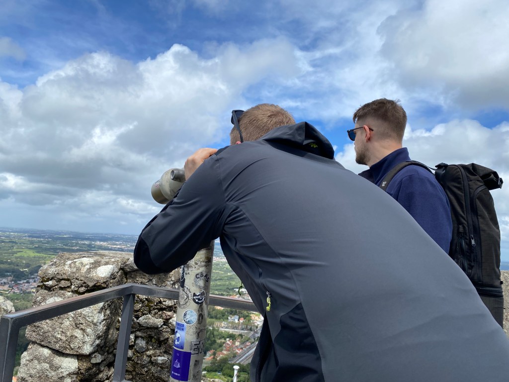 And man, what a castle it is. At 412 meters above sea level, the ramparts offer unrivaled views of Portugal, stretching all the way to the water. The castle walls roll along the hillsides like the spines of slumbering dragons, so all the while you’re walking you have your eyes on the very top tower. We made it up there and paused to take in the view, which included the nearby Palácio Nacional da Pena. Even from the castle, it looked beautiful, a pinkish color popping against the clear blue sky.