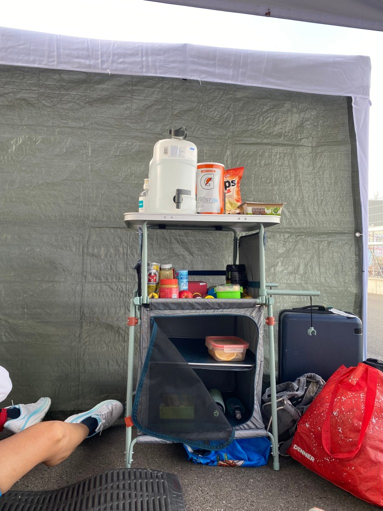 Our tent home was very cozy. Dan helped put up the “walls”, Ringo had brought along a camping shelf/table system, and me, Amy, and Kelly had laid out our yoga mats and had our duffel bags strategically placed along the wall. All of us had food and electrolytes. Ringo’s camping stand had a water jug on top, bags and cylinders of electrolyte powder, and shelves stocked full of snacks for us all to share.