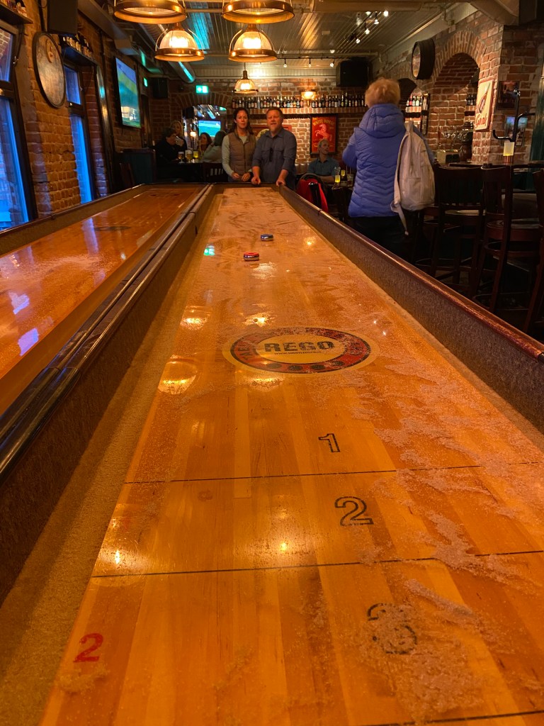 Our next stop was a nearby pub that offered shuffleboard and darts. Where Oslo’s past battles may have featured axes and Vikings stampeding across meadows, its current battles take place on shuffleboard tables with pucks, powdered wax, and a handy little broom to sweep off the table in between rounds. We arrived at exactly the right time. In a matter of minutes, a family arrived and claimed the shuffleboard table to our left. Others grabbed beers from the bar and settled in at high tops nearby, eyeing our progress.