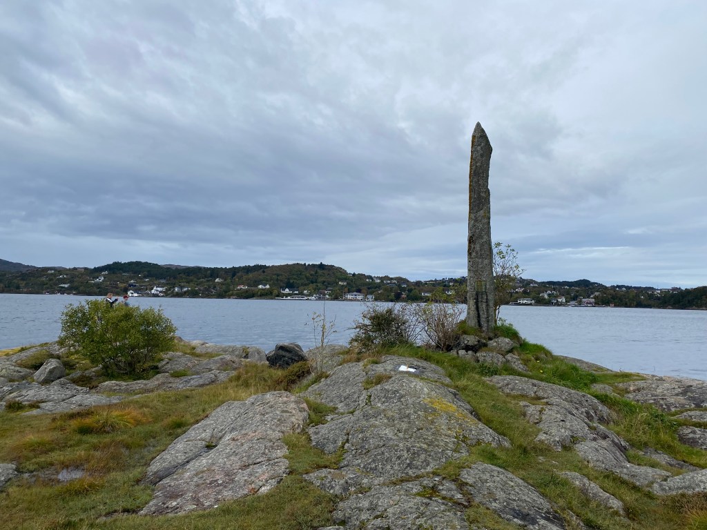 We layered up and wandered down to the edge of our little peninsula, where a memorial monolith for King Håkon stood like a stone lighthouse along the water. Its rough structure recalled Viking aesthetic, so I was surprised to read it was constructed in 1921.