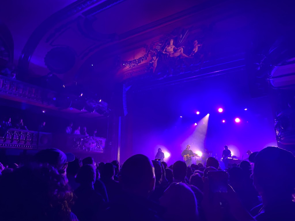 From there, it was on to see Sturgill Simpson! A four minute walk, Le Trianon theater towered over the sidewalk and looked stately and majestic. Then we realized we’d walked into the wrong theater. As we stood on the stairs and an usher tried scanning Holly’s ticket, I wondered why the upstairs was bathed in purple and blue strobe lights and blasting thumping house music. This seemed a strange vibe for Sturgill.